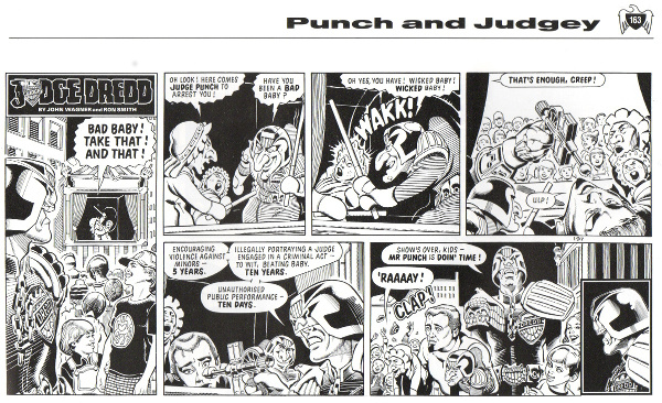 Dans cet univers nous suivons les aventures de Dredd, le plus impitoyable des juges. Sa seule fonction d’épisode en épisode est d’asséner la loi sur divers types de récalcitrants. En ce sens, Dredd devient une sorte de Captain Obvious pour une revue destinée aux jeunesses fascistes. Les histoires sont courtes avec des enjeux et des résolutions d’une simplicité enfantine. Tout est juste là pour que le personnage puisse balancer ses banalités aux lecteurs. Sauf que celles-ci s’accompagnent d’actes dictés par un comportement réactionnaire pour le moins effarant. Si on cherche un équivalent cinématographique au comic, on le trouverait vers le Starship Troopers de Paul Verhoeven. L’un comme l’autre se construisent selon le principe d’une œuvre de propagande provenant d’une époque lointaine et fictive (en apparence tout du moins). Chacun refuse également d’offrir un mode d’emploi clair sur la manière d’appréhender ce qui est montré. L’intérêt des deux œuvres tient justement dans la façon dont elles intègrent en leur sein des composantes propagandistes plus ou moins puantes. Judge Dredd et Starship Troopers respectent les principes de communication d’une idéologie douteuse en employant des systèmes attractifs flagrants. Chez Verhoeven, il y a toute l’utilisation de mécanisme narratif héritée du soap opera. Chez Wagner et Ezquerra, c’est donc cette figure du héros impeccable sans peur et sans reproche. Ils constituent des bons moyens pour endoctriner le public cible sans que celui-ci ne s’en rende compte. Comment alors mettre en évidence le danger de telles méthodes lorsque l’œuvre les respecte si bien ? Si l’intrigue n’offre aucune indication nette, le spectateur ou le lecteur doit les trouver par rapport au ton étrange se dégageant de celle-ci. La mise en garde, il la saisira si il perçoit correctement cette violence joyeusement outrancière et cet humour terriblement second degré. Enfin, chez Judge Dredd, c’est le trente-sixième degré qui est atteint. Si la bande dessinée veut bien volontiers épingler les dérives de notre société actuelle, elle la représente sous des formes complètement déjantées et difficiles à prendre au sérieux.