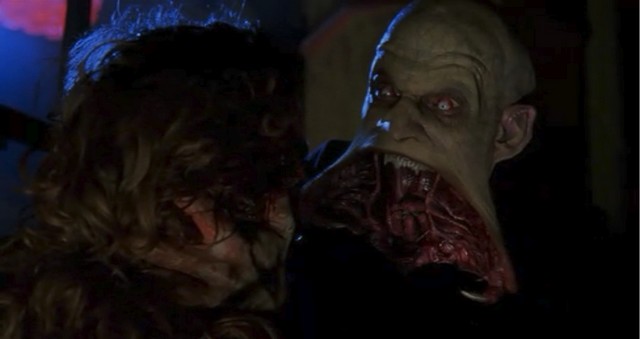 Dès lors, tout y passe dans une cuisine hybride qui accouche au final d’un sacré hamburger, coinçant un ride horrifique ultra-saignant entre un actionner au-delà du bourrin et une épopée romantique à la richesse symbolique proprement inouïe. Del Toro ne se fixe alors aucune limite et s’autorise tout ce qui lui semble adéquat, du moment que l’effet adopté peut enrichir (ou introduire) un personnage, entraîner une évolution spontanée de l’intrigue, et surtout, renvoyer de façon sensitive à la puissance évocatrice des langages respectifs des sous-cultures précitées. La liste des influences file ici le vertige : les compositions triangulaires de Frank Frazetta sont ici magnifiquement retranscrites dans une poignée de plans mettant en scène des personnages en état de surpuissance (dont un où Nomak dévore sa proie debout sur une montagne de cadavres), la plongée du chef des vampires dans son bain de sang renvoie littéralement aux cases de Mike Mignola, un personnage de geek fumeur de pétards enchaîne ici les clins d’œil directs (un T-shirt noir à l’effigie du BPRD d’Hellboy, un dialogue qui relie une situation de danger au travail de Frank Miller sur Batman, etc…), le festival de claques entre Blade et l’über-nazi Reinhardt (génial Ron Perlman) nous ramène au western-spaghetti-fayot popularisé par Terence Hill, les combats regorgent de plans sous haute influence manga (la mort de Reinhardt et le duel final sont en connexion directe avec le Ninja Scroll de Yoshiaki Kawajiri), la lumière bleue des bombes à UV qui désintègrent les vampires autour de Blade semble reproduire l’explosion du Dr Manhattan dans la BD Watchmen, sans parler de quelques effets de style en liaison directe avec les goûts cinéphiles du scénariste David S. Goyer (le Bloodpack lorgne ici autant sur Aliens que sur Les douze salopards, Blade sort d’un bain de sang comme Martin Sheen dans le dernier quart d’heure d’Apocalypse Now, etc…).