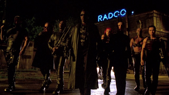 Les mauvaises langues pourraient dire que Del Toro s’est juste limité à tout compiler comme bon lui semblait, faisant plier la logique narrative et stylistique de son film sous l’effet du fun à tout prix. Sauf que, on insiste encore, chaque effet référentiel sert le film pour l’enrichir de toutes parts, avec un souci de cohérence qui ne se retrouvera jamais en porte-à-faux. Signe d’une intrigue conçue comme un crescendo conscient et jamais bordélique, c’est dès son introduction que Del Toro donne le tempo de ce qu’il souhaite mettre en place. Une fois les choses mises au clair par biais d’une rapide introduction des fameux « faucheurs » (une très judicieuse façon d’inverser la logique du piège vampire dès la première scène) et d’un élégant générique récapitulatif signé Kyle Cooper, une triple scène d’action vient tout à coup intégrer trois modes d’iconisation successifs. En somme, on y voit Blade qui se freeze soudain en ralenti dans un plan furtif en regardant la caméra (un peu comme le Coyote au début d’un cartoon de Bip Bip !), qui poursuit des vampires dans des couloirs sombres à la Doom, et qui finit par les massacrer dans de grands envolées chorégraphiques à la sauce HK, le tout avec déjà une bonne dizaine de plans impossibles qui s’impriment dans notre rétine (dont un saut d’immeuble pour le coup vertigineux, fusion composite de trois plans). On n’a même pas dépassé les cinq minutes de visionnage, et on croit déjà notre mâchoire capable de se décrocher comme celle des « faucheurs ».