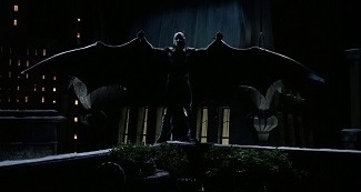 Avec deux personnages aussi mémorables, on en oublierait presque Batman. On n’aurait d’ailleurs pas tort, vu que le personnage semble passer tout le film à réclamer qu’on l’oublie. Au fond, quel ravalement de façade Burton réserve-t-il ici à l’hydre à deux têtes formée par Bruce Wayne et Batman ? Ni plus ni moins qu’un aller simple pour l’obscurité et le chaos. Plus encore qu’avant, l’homme n’est plus qu’un individu toujours plus replié sur lui-même, toujours moins tourné vers l’extérieur, presque une page blanche au regard de ce que le premier film avait installé – le chapitre Vicky Vale est ici dégagé en deux répliques. La façon qu’a Burton de réintroduire ce personnage que l’on connait déjà est édifiante. Dès sa première apparition, le milliardaire reclus n’apparaît pas au travers de son déguisement ou d’une quelconque action héroïque, mais en tant que silhouette figée dans une posture évoquant le Penseur de Rodin, sans doute déjà taraudée par des idées noires et confondue d’entrée avec le mobilier d’un manoir plongé dans une obscurité quasi totale. C’est seulement le Bat-signal qui le remet dans la lumière, et ce par le biais d’un système sophistiqué qui amène le reflet de son logo culte jusqu’à la pièce où il se trouve – c’est à croire que l’homme s’est coupé du monde extérieur au point de ne plus jeter un coup d’œil par la fenêtre ! Tout au long du film, sortir au grand jour et rejouer les justiciers ne se fera qu’en singeant un regard teinté de lassitude et de mélancolie, comme si l’ombre avait définitivement pris le dessus sur la lumière commune du corps et de l’esprit. Là où le premier film plaçait la carapace au-dessus de l’enveloppe réelle, cette suite en prend acte pour révéler quelque chose d’intrinsèque à son antihéros, ici soumis à un énorme cas de conscience. Quasiment éclipsé par ceux qu’il combat (et qu’il s’échine à juger comme des ennemis et non comme des miroirs), Batman reçoit ainsi en pleine face le boomerang de son isolement : perdre son statut de figure mythique face à la manifestation débridée de l’Autre, se sentir dépossédé de son aura par une société corrompue et malade, et finir en figure mélancolique accrochée au plafond urbain, condamnée à contempler de haut cet espace qui fut le sien. C’est là tout le paradoxe : après avoir passé tant de temps à se déguiser en chauve-souris, Bruce Wayne a fini par en devenir une. Littéralement.
