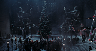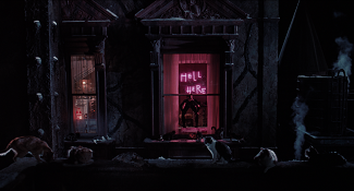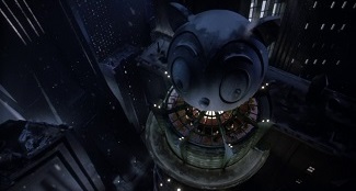 Aussi torturé que les figures tragiques qui le peuplent, Batman, le défi n’est ainsi pas un film qui invite à juger qui que ce soit ou quoi que ce soit, et ce alors même qu’une action entreprise par untel ou untel franchit parfois la frontière de l’immonde (les complots du Pingouin pour éliminer à grande échelle la jeunesse de Gotham font froid dans le dos !). La complexité et l’ambivalence sont ici des maîtres-mots, mariant la légèreté et la noirceur jusqu’à les rendre irréconciliables. Et c’est au fond parce que le décor urbain lui-même définit ceux qui y vivent. A Gotham City, tout le monde veut « paraître » et non « être ». Une « princesse de glace » qui allume chaque soir l’arbre de Noël afin d’émerveiller les citoyens n’est au fond qu’une Miss un peu cruche, persuadée de son talent d’actrice en dépit de son surjeu glamour et de son incapacité à retenir les deux seules actions de son rôle. Un riche industriel qui répand la pollution dans les égouts passe ici pour un bienfaiteur local pour cause de conditionnement publicitaire généralisé. Même le maire n’est plus un rôle décisif pour la gestion d’une cité mais un siège vacant destiné à servir les intérêts d’une tierce personne au détriment des résidents. Au fond, Gotham assombrit ici sa propre image : une cité du vide fascisante où les gens de la surface ont l’âme aussi noire que ceux des profondeurs. Rappelons que dans le dernier quart du premier Batman, le Joker jouait ouvertement sur l’avidité des habitants de Gotham en leur balançant des millions de dollars en pleine rue avant de les empoisonner. Burton amplifie ainsi cette lecture d’une Babylone funèbre et maladive en superposant enfin le visage d’une mégalopole à celui de ses habitants, qu’ils soient masqués à l’intérieur ou à l’extérieur. La simple réécriture d’une pancarte néon « Hello There » en « Hell here », et ce au moment même où Selina se livre au saccage cathartique de son appartement, constitue un raccourci très direct de cette lecture : à partir du moment où les repères civilisés s’effondrent autant que les barrières de la raison, l’enfer s’impose ici et là, topographié, ténébreux, total.