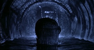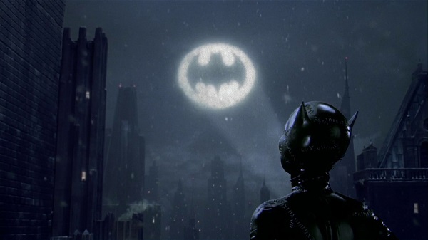 Le génie de Burton pour redessiner les contours de son décor à l’image de tous ceux qui s’y agitent ne fait alors plus aucun doute. Il ne manquait ainsi plus qu’un récit capable de larguer les frontières du réalisme au profit du fantastique tordu pour que l’essai du premier Batman soit intégralement transformé. Quand bien même on sait qu’il s’agissait là d’un ajout de dernière minute effectué par Burton, cette fameuse lecture des « neuf vies » cataires renforce l’aura du personnage de Catwoman. Sa « résurrection » grâce à l’intervention des chats suite à sa chute mortelle, puis les balles successives tirées par Shreck qui ne semblent pas capables de la tuer sur le coup, et enfin ce mystérieux plan final qui semble prendre acte de l’authenticité de sa « dernière vie » : les voies du réalisme ont visiblement plié boutique en vue d’investir la mythologie à l’état pur. De même que la mort du Pingouin pour cause de chaleur intolérable chez les vrais pingouins laisse à penser qu’une métamorphose surnaturelle a bien eu lieu. Mais voyons-y plutôt la suite logique de la lecture symbolique du film, entièrement chuchotée par le mouvement et les rapports d’échelle. D’un côté, on a une caméra qui impose un mouvement vers le haut ou vers le bas afin de tracer des connexions cachées dans l’action ou dans les sentiments. Quelques exemples : ce cadrage vertical du discours solennel du maire vers la bouche d’égout où va surgir le Pingouin, ce dernier qui redescend de sa sombre cage dorée pour rencontrer son équipe électorale, et surtout ce plan final où Bruce Wayne roule en silence dans les bas-fonds tandis que son énième trauma – romantique celui-là ! – surgit sur les hauteurs pour contempler le Bat-signal. De l’autre, on a une série d’espaces en surplomb qui imposent une folle profondeur de champ dans la quasi-totalité des plans larges (la Batcave et les toits de Gotham prennent ici une toute autre ampleur). De mémoire, on ne voit que le Metropolis de Fritz Lang ou le Dark City d’Alex Proyas pour avoir infusé un néo-expressionnisme si riche dans un décor urbain. En tout cas, d’un côté comme de l’autre, la cohérence se fait totale entre l’espace et le propos, tissant mille passerelles tangibles entre les deux strates conflictuelles d’un même univers. Emerger ou régresser : c’est là l’enjeu central des personnages qui devient constamment celui de la caméra et du découpage, signe d’une mise en scène magnifiquement réfléchie en amont.