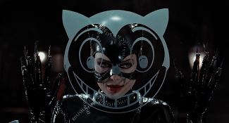 L’hypothèse d’une satire lâchant ses grenades sur un capitalisme qui devient lui-même son propre fossoyeur trouve sa plus parfaite démonstration au détour d’un autre symbole, là encore animal mais plus tordu. Sans doute conscient d’avoir les armes nécessaires pour contrer l’exploitation de sa propre création (car son film est aussi un « produit »), Burton se montre ici aussi subversif que Joe Dante sur Gremlins 2, osant ainsi prendre à revers la logique du « produit marchand » qui entourait déjà le premier Batman à l’époque de sa sortie. Et c’est très clairement grâce à Catwoman qu’il y parvient. Premier point : cette « méchante » s’avère trop sadique et sexuellement ambiguë pour s’adresser à un public jeune. Les protestations de nombreux parents et le retrait d’une célèbre marque de fast-food en tant que sponsor n’étonnent guère – chapeau bas à Burton et Waters pour avoir fui toute précaution d’ordre commercial pendant l’écriture du film. Deuxième point : le traitement du motif du chat impose une rupture radicale par rapport à celui qui orne le costume de Batman. En effet, ce chat qui donne son identité publicitaire à l’empire commercial de Shreck est le signe d’un consumérisme carnassier, vicieux, pour ne pas dire absurde, qui se dissimule derrière le sourire faussement rassurant d’un animal réputé pour son comportement ambigu et individualiste (d’autant que ce sourire rappelle surtout celui du chat d’Alice au Pays des Merveilles !). Tout ce qui se propage à partir de cette image faussée devient matière à tromper ou à appâter le pigeon, parfois de la manière la moins subtile qui soit. Là-dessus, les annonces publicitaires que Selina reçoit sur son répondeur se passent presque de commentaires : c’est en écoutant une invitation à tester un parfum vendu par le groupe Shreck, avec la garantie qu’une simple vaporisation saura convaincre son patron de la faire grimper aux rideaux en dehors des heures de travail (!), que la belle pète les plombs et amorce sa transformation en femme-chat ! Entre Shreck et Selina, le vrai félin n’est au final pas celui que l’on croit : tel un Frankenstein dépassé par sa création, le premier n’a fait qu’accélérer malgré lui la renaissance de la seconde sous la forme d’une entité animale et instable qui détourne – tout en le subvertissant – le logo de son propre empire. On a connu des audaces subversives bien moins parlantes et universelles que celle-ci !