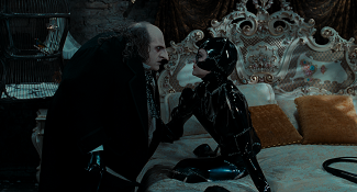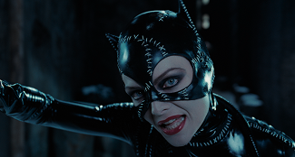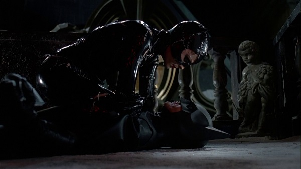 Ce traitement radical est également appliqué à Selina Kyle (inoubliable Michelle Pfeiffer), secrétaire au schéma interne toujours plus déchiré par le compartimentage ambiant : d’abord celui imposé par son entourage (sa mère, toujours audible sur le répondeur, ne cesse de la pousser à larguer sa solitude et à trouver un vrai travail), ensuite celui imposé par son travail (qui la bloque dans ses aspirations professionnelles et la réduit à servir le café à des politicards mesquins). Jetée du haut d’un gratte-ciel par son ignoble patron Max Shreck (Christopher Walken) à la suite d’une indiscrétion fatale, elle devient alors Catwoman, féline maléfique et noctambule autant que fantasme ambulant et perturbant. Avec ce personnage, Burton se retrouve là aussi avec de l’or entre les mains. Catwoman se révèle si ambivalente et torturée qu’elle ne cesse de franchir les extrêmes un à un, sans limite ni frein, jouant à loisir sur différents tableaux : la revanche des réprimées sur une gent masculine duplice, l’expression plein cadre d’une sexualité retrouvée, l’imagerie SM comme signe extérieur du chaos intérieur, et surtout, la spirale conflictuelle des mots et des actes dans chaque situation. L’entendre demander à Batman de l’aider à trouver « la femme derrière le chat » montre bien comment elle (dé)raisonne : une supplication qui se change peu à peu en provocation, une paranoïa qui dérègle la raison, un rapprochement qui cache l’obsession à vouloir (se) faire mal. Face au Pingouin avec qui elle désire s’allier contre Batman, le tableau est encore plus saisissant : Eros et Thanatos dans la même pièce, enfilant les sous-entendus sexuels et les actions équivoques (manier un parapluie-couteau, caresser une chatte noire, gober un oiseau, etc…). Deux dualités au carrefour de la déviance et du ravage, exhibant une haine du monde dont Burton va systématiquement tirer profit.