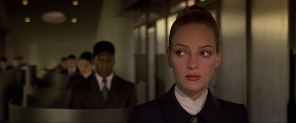 Signe que l’on intègre vite les instincts qui fondent la société dépeinte dans le film, on suppose instantanément que les parents du dit pianiste auraient choisi que leur enfant naisse ainsi dans l’optique d’en faire un prodige (ou un « freak », c’est selon). De fait, si chaque couple peut choisir le « meilleur » embryon, il peut bien en choisir un présentant une anomalie si celle-ci est envisagée comme profitable pour l’avenir ! Par moments, on entrevoit les implications, terribles et vertigineuses, des pratiques qui ont cours dans cette société-là et dont le scénario ne peut bien entendu montrer que quelques cas de figure. Andrew Niccol a le bon goût de le faire, parfois, sur le ton de l’humour : le médecin qui teste régulièrement Vincent lui dit, en le regardant uriner, « Vous ne vous cachez jamais. Vous pissez sur commande. En même temps je vous comprends, très bel équipement ! (…) Je me demande pourquoi mes parents ne m’en ont pas commandée une comme celle-la… ». Mais le tout fait surtout froid dans le dos. D’autant plus que le cinéaste tend moins vers une déclinaison futuriste des grands totalitarismes du XXe siècle que vers un réalisme, une vraisemblance qui nous fait relativiser le caractère science-fictionnel de la société qu’il peint. Le régime décrit demeure une démocratie, et l’on apprend au détour d’une réplique que la discrimination y est encore condamnée par la loi. Il n’y a ni haine, ni violence. Par contre, il y a une dérive discrète et insidieuse de la volonté toute légitime d’améliorer le sort de l’humanité. La société dont le centre spatial GATTACA offre un aperçu est une utopie de l’excellence que ses aspects arbitraires transforment en cauchemar. Il suffit d’avoir un seul prélèvement bénin du corps d’un individu pour pouvoir obtenir en un rien de temps, dans un centre de test, la séquence de son ADN et savoir ainsi s’il est « Viable » ou « Non-Viable ». Là encore, le dialogue frappe : « Je viens de l’embrasser il y a cinq minutes » dit une femme à l’employé du centre qui prélève un peu de son rouge à lèvres pour la renseigner sur le patrimoine génétique d’un homme qui lui plairait à priori mais qui doit être « Viable » pour qu’elle pousse plus avant leur relation ! Le beau rôle d’Uma Thurman est lié aux mêmes enjeux amoureux : en demandant secrètement des tests de Vincent (en fait, elle teste sans le savoir un poil de Jérôme volontairement laissé sur son bureau par Vincent), elle veut vérifier s’il est aussi « parfait » que ce que sa réputation au travail laisse entendre ; mais elle appréhende cette perfection, craignant que son insuffisance cardiaque à elle ne suscite que son mépris à lui. La beauté de l’actrice, que l’on pourrait qualifier de « pure » dans le sens où chaque gros plan sur son visage laisse supposer que son personnage est « Viable », « parfait », offre un contre-point percutant à cette insuffisance cardiaque qui suffit à priver Irene d’un voyage vers le satellite Titan.