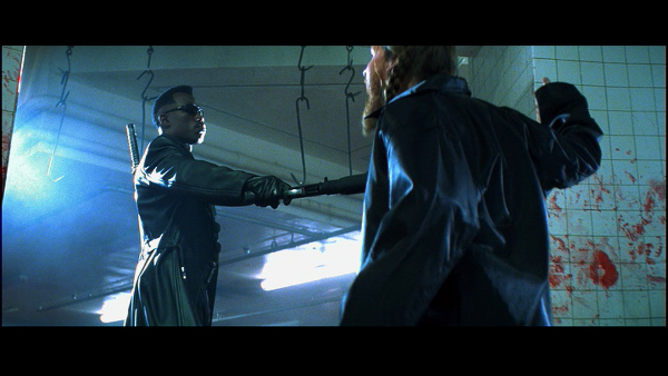 Suite aux meurtres de ses parents, Bruce Wayne luttait contre le crime comme une façon d’exprimer ses psychoses. Blade a un passé équivalent (la mort de sa mère mordue par un vampire) et avoue lui-même que sa lutte contre les suceurs de sang est un moyen de récupérer son humanité. Une bonne illustration de cela serait la préparation au combat final. Couramment, ce genre de scène bénéficie d’un montage au cordeau montrant le héros ajustant chaque pièce de son armement. Il s’agit de mettre en avant la détermination d’un héros qui sait que le point de non-retour a été dépassé et qu’il n’a plus qu’à embrasser la fin qui lui est destinée. Ici au contraire, la scène est très calme. Aucune poussée d’adrénaline n’est voulue et le regroupement des armes est mis en parallèle avec la méditation bouddhiste du héros. La scène montre comment cette préparation permet au personnage d’atteindre une paix intérieure. Une paix qui sera redéfinie lorsque Blade devra faire face à certaines révélations et mettre en œuvre un précepte zen selon lequel la délivrance nécessite de tuer père, mère et Bouddha (à noter que le concept fut apporté par Fincher lorsqu’il plancha furtivement sur le projet). On touche ainsi à une autre qualité du script : la définition des personnages par l’action. Goyer rappelle dans son commentaire audio qu’il est parfois inutile d’écrire des dialogues tant une image suffit. Blade brille souvent par cette qualité de résumer la personnalité des personnages grâce à quelques images efficaces. On regrettera toutefois que Goyer n’ait pas maîtrisé cette compréhension jusqu’au bout et que certains dialogues s’avèrent particulièrement redondants (Deacon Frost affirmera un nombre incommensurable de fois qu’il a besoin de Blade vivant). Honnête, Goyer admet lui-même qu’il a commis quelques erreurs.