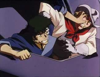 C’est ce que pose d’emblée le premier épisode de la série Asteroid Blues. Rétrospectivement, on se rend compte que cet épisode inaugural annonce déjà le final. Spike y recherche Asimov et Katrina, un couple qui a volé un stock de drogue au gang pour lequel il travaillait. Leur but est de le vendre rapidement, puis s’enfuir pour se bâtir une nouvelle vie. Ils sont traqués de toute part et Asimov est de plus en plus épuisé par ses pulsions ultra-violentes suite à la consommation de la drogue. Dans le premier des deux seuls contacts qu’ils auront, Spike joue pratiquement un rôle d’oracle pour le couple en leur affirmant que leur fuite est vouée à l’échec. Une ironie puisque c’est justement un oracle qui le mettra sur la voie des deux personnages. L’impossibilité de l’échappée se retrouve avec le ventre gonflé de Katrina qui ne contient pas un bébé, symbole d’avenir, mais la drogue qui consume son compagnon. À l’inverse de Spike, Katrina accepte l’illusion de son rêve et le chemin funèbre qu’elle a emprunté, tuant Asimov pour abréger ses souffrances avant de se suicider en forçant un barrage de police. Il faudra attendre The Real Folk Blues pour que Spike fasse de même et aille au bout de sa propre histoire.