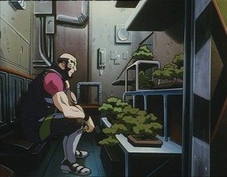 Entre ces deux extrêmes, on trouve deux autres extrêmes : la juvénile Edward Wong Hau Pepelu Tivrusky IV (dit Ed) et le patriarche Jet Black. Ed finira la série en quittant le Bebop accompagnée du fidèle Ein et en traçant son propre chemin. Personnage excité et déluré, Ed symbolise tous les privilèges de la jeunesse qui est libre d’arpenter à loisir le rêve et de s’en nourrir autant qu’elle peut. Membre le plus âgé du Bebop, Jet a également récupéré ce privilège. Les deux épisodes centrés sur sa personne lui ont permis de mettre de l’ordre dans ses affaires en suspens, qu’elles soient de nature professionnelle dans Black Dog Serenade ou sentimentale dans Ganymede Elegy. Il n’a plus rien qui l’attache à la réalité et au crépuscule de sa vie, il a le droit de profiter du monde du rêve. Un détail ne trompe pas sur cette position favorisée dans l’épisode Mushroom Samba. Désireuse de tester les effets de champignons hallucinogènes, Ed en refile à chacun des membres de l’équipage. Spike et Faye auront des délires en lien avec leurs problèmes. Spike est condamné à monter éternellement les marches vers le paradis sans jamais l’atteindre. Faye s’imagine en train de se noyer et tente en vain de rejoindre la surface. Quant à Jet, on le voit philosopher avec ses bonzaïs. Sauf que contrairement à ses deux comparses, il n’y a aucune représentation de sa vision délirante. Probablement parce qu’il n’y a pas autre chose à montrer que ce qu’est déjà sa réalité. Jet vit pleinement son fantasme et il aura tout le temps de le poursuivre en étant au final le seul membre résidant dans le Bebop.