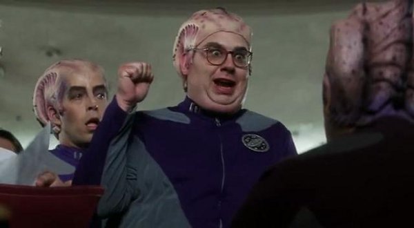 En ce sens, Galaxy Quest est une variation particulièrement complexe et tordue du motif thématique évoqué plus haut ; là où normalement c’est la fiction qui tend à imiter le réel, le schéma est cette fois-ci inversé ; le référent est ici la série originelle – elle même une joyeuse caricature de la série Star Trek – qui nous est montrée comme particulièrement peu crédible : effets spéciaux dépassés et risibles, interprétation cheap des acteurs, écriture médiocre, … Ce référent, ô combien imparfait, sert de matrice autant aux costumes des fans de conventions qu’au vaisseau spatial thermien. Dans les deux cas, la réalité des fans ou des Thermiens, tour-à-tour pathétique ou grandiose, est générée par la série.