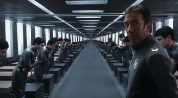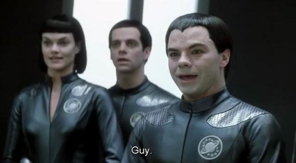 Le personnage de Guy (superbe Sam Rockwell) est symptomatique de cet humour ; il est le seul acteur embarqué dans l’aventure à ne pas être un personnage récurrent de la série, mais un simple figurant (« crew member number 6« ) ; son attitude pessimiste lui fait considérer, suivant la situation, soit les règles de la réalité soit celles de la fiction ; ainsi il craint de mourir car il n’est qu’un simple figurant sacrifié avant une coupure publicitaire afin de redonner un peu de souffle dramatique dans un épisode de la série et d’un autre côté, lorsque le Sergent Chen ouvre spontanément la porte d’une navette alors qu’ils viennent d’atterrir sur une planète inconnue, il crie : « Hey ! It’s an alien planet ! Is there air ? You don’t know ! », réaction en décalage certain avec la physique plutôt conciliante de ce genre de série. D’un côté, il s’inquiète de ne pas être un héros prédestiné, de ne pas rentrer dans le carcan du héros de fiction, de l’autre il s’inquiète aussi des dangers « réalistes » de leur aventure.