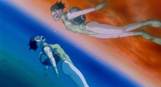 Ce besoin d’échapper à son enveloppe se trouve dans une autre grande scène intégralement réimaginée. Dans le manga, Kusanagi et son équipe doivent s’infiltrer sur un bateau en faisant de la plongée sous-marine. Il est mentionné la dangerosité de cette pratique pour les corps cybernétiques, le moindre dysfonctionnement les faisant couler à pic. Dans le film, le risque importe peu pour Kusanagi. S’affirmant comme son seul passe-temps hors du travail, la plongée est pour elle un moyen d’atteindre l’essence de son esprit. Totalement isolée du monde, elle peut chercher à embrasser son moi profond (l’imagerie se passe de commentaire). Comme elle le relève plus tard à Batou, son asociabilité est engendrée par sa crainte à ce que son rapport aux autres définisse son identité. Que sa différence en tant qu’individu ne s’exprime que par la manière dont on la traite et non pour ce qu’elle est. Ce qui renvoie à la célèbre séquence contemplative de mi-parcours. Dans ce Tokyo où se mêlent hyper-technologie et urbanisme dégradé, on croise plusieurs modèles du corps de Kusanagi. Simple passante ou mannequin dans une vitrine, cette prolifération de corps manufacturé est un miroir se dressant quotidiennement devant Kusanagi et l’empêchant de se définir. Sa relation avec Togusa le dénote également. Dans l’œuvre de Shirow, Togusa est souvent charrié pour son statut de novice et son corps quasiment non retouché. Chez Oshii, Kusanagi voit au contraire dans cet organisme naturel sujet à l’illogisme et l’imprévisibilité une force et fait part d’une certaine envie envers celui-ci.