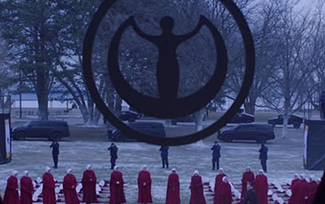 La palette colorimétrique ci-dessus représente bien les couleurs dominantes de la série et situe notamment le contraste du bleu et d’un rouge assombri. La République de Gilead semble jalonnée de repères visuels qui renvoient bien sûr à une société de classe, sur un modèle quasi féodal mais aussi aux valeurs qu’elle prône. Cette société renvoie à l’imaginaire stalinien : prétendre donner sa place à chacun mais finalement effacer les identités et les fondre dans un collectif aliénant. Le régime est ici particulièrement hypocrite puisque seuls les hommes sont valorisés et ont accès aux fonctions de commandement, la femme est supposée être vénérée car porteuse de vie mais on la marginalise et brutalise, et ce, de manière graduelle. L’explosion de l’horreur sera marquée par les colonies qui se dressent en goulags des temps modernes. Mais l’intertexte ne nous renvoie pas seulement aux grandes dictatures qui ont secoué le XXe siècle (le logo d’aigle peut faire penser au IIIe Reich) mais esquissent aussi une toile de fond religieuse. Le drapeau de Gilead représente une colombe encadrée de rameaux tandis que le symbole des servantes écarlates représente une mère inscrite dans un cercle, probablement pour refléter le renouveau du monde et l’éternité. Echo aux déesses de la fécondité pendant le néolithique et l’Antiquité. Les servantes que l’on dispose systématiquement en cercle, mais aussi le logo qui les symbolise. Dans cet univers tragique, on remarque deux constantes colorimétriques qu’on associe volontiers aux servantes écarlates : le blanc et le rouge.