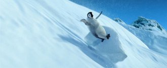 La mise en scène passe cette idée par des mouvements de caméra absolument incroyables et irréalisables dans le cinéma traditionnel. De l’immensité d’un environnement, la caméra nous ramène régulièrement vers un microscopique détail. Ce qui était en arrière-plan passe au premier plan et vice versa. Miller fait un jeu constant de perspectives pour établir un régime de valeurs complexe où chaque élément se montre interconnecté l’un à l’autre. Si l’épisode deux contient de formidables exemples (Mumble pourchassé par un léopard des mers alors qu’il est chevauché par les deux krills), c’est dans le premier opus que se trouve l’exemple le plus frappant. Il s’agit probablement de la séquence la plus jubilatoire du film : la descente en glissade de la falaise. La scène est l’illustration parfaite des enjeux de mise en scène de Miller. Ainsi est-il capable dans un plan consistant en un long rapide travelling de commencer sur un plan large et de conclure sur un énorme gros plan, tout en maintenant la sensation de vitesse et en multipliant la disposition des personnages. Ce type de plan se multiplie jusqu’à une conclusion orgasmique. La petite virée de Mumble et ses potes conduira à une avalanche de laquelle s’extraira une pelleteuse. Ce qui était alors une scène d’action amusante mais un brin gratuite débouche alors sur une situation à risque et surtout une découverte qui renforcera la conviction du héros qu’il existe un monde plus vaste par-delà ce qu’il connaît.
