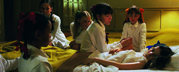 Concernant leur apprentissage des sciences naturelles, une métaphore revient très souvent : celle de la chenille qui devient progressivement un papillon, destiné à prendre son envol et à rechercher un partenaire pour assurer sa descendance. A partir du moment où Iris s’est habituée au pensionnat et Alice s’est évaporée du récit, l’intrigue se focalise donc logiquement sur Bianca, dont l’enseignement sera dès lors davantage axé sur la danse, donc sur le corporel. Celle-ci va alors découvrir sa sexualité tout en appréhendant difficilement le moment où elle quittera ce pensionnat. Lorsque ce moment décisif arrivera, elle s’interrogera : « Qu’est-ce qui va nous arriver ? ». La réponse de son ancienne institutrice sera aussi évasive que brutale : « Ce qui est sûr, c’est que tu vas nous oublier très vite ». Ce train vers l’inconnu sera alors un adieu à l’enfance, un au revoir douloureux à cette innocence si précieuse. Que le film soit resté mystérieux sur l’envers du décor ne l’aura pas empêché d’être limpide sur son fond symbolique, lequel nage avant tout dans le monde fantasmatique de l’enfance. C’est une séquence de l’évolution qu’il aura métaphorisé jusqu’au bout. Ici, on renaît dans un cercueil, on y découvre sa nouvelle peau et celle des autres, on se confronte à un système éducatif qui impose une certaine forme de manipulation (« L’obéissance est le seul chemin qui mène au bonheur »), on voit les rivalités qui s’installent, on sent son innocence originelle s’effilocher, on suit la transformation de son propre corps, on contemple la tragédie de (ne pas) grandir, on repense à la Nature comme un éden perdu et aliénant, et on garde toujours en tête que la mort rode à chaque recoin du monde.