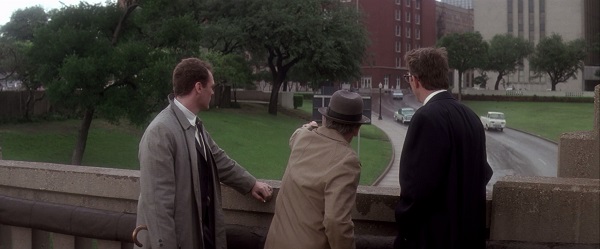 On en prend très bien le pouls au travers de multiples articulations de ce découpage incroyablement complexe et sophistiqué que Stone et ses deux monteurs (oscarisés à juste titre) ont mis en place. Prenons l’exemple de ces images furtives d’un orage en Louisiane, casées dans le montage lorsque Garrison démonte l’argument de David Ferrie (Joe Pesci), lequel prétend alors avoir fait du patin-à-glace le jour où il y avait pourtant l’un des plus violents orages de l’année. Ce n’est pas là une façon pour Stone de surligner un argument ou de paraphraser bêtement ce qui est énoncé, mais un moyen brillant d’intercaler une image dite « mentale » entre ce qui est dit et ce qui est suggéré, cette image servant ainsi à affaiblir l’argument et à chuchoter le contre-argument. Même verdict pour ce trucage progressif à base de cutter et de photomontage qui suit le récit du parcours d’Oswald jusqu’à son inculpation pour assassinat, ou encore pour cette réinterprétation réitérée du rôle et de la position d’Oswald au sein du dépôt de livres de Dallas au moment de l’assassinat – la scène se retrouve alors rejouée et recorrigée au gré des hypothèses et des indices, sans certitude aucune. En agissant ainsi, Stone valide à son corps défendant cette contre-théorie selon laquelle on ressent dans JFK moins une vérité livrée clé en main que le brouillage conscient de cette même vérité. Dans la mesure où cette dernière – conjuguée au conditionnel, on insiste – repose ici sur un gigantesque vertige plastique alimenté par la force du découpage, on peut même dire que Stone s’est fait, le temps d’un film, l’égal involontaire d’un Brian De Palma (lequel avait d’ailleurs théorisé l’assassinat de JFK dans Greetings), acquis depuis trop longtemps à la lecture théorique de l’image en tant que manipulation. Et c’est ainsi au documentaire et à la série que Stone réserve le droit et l’honneur de remettre la vérité vraie sur le devant de la scène après avoir pratiqué une longue inception de 3h26 dans le cerveau de son spectateur au travers du film de 1991.