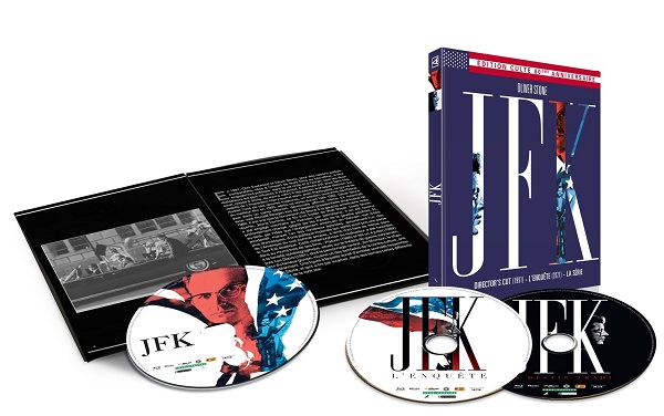 Il est étrange que le film le plus populaire d’Oliver Stone soit celui qui ait mis autant de temps à trouver le chemin du support haute définition. D’autant que le DVD édité par Warner avait très vite montré ses limites en matière de contenu éditorial dès sa sortie en 2001, cet éditeur se montrant toujours aussi peu motivé à l’idée de sous-titrer ses commentaires audio pour un public non anglophone. On ne voyait pas comment le transfert de ce matériel d’un éditeur à un autre allait changer quoi que ce soit, et là-dessus, sans surprise, les passionnants commentaires d’Oliver Stone sur le film ainsi que sur cinquante-cinq minutes de scènes coupées sont toujours dépourvus de sous-titres pour ce premier Blu-ray supervisé par l’Atelier d’images. En dehors de cela, les moyens ont été déployés pour rendre justice à la puissance du film, à son impact ainsi qu’à la place toujours indispensable qu’il occupe dans l’Histoire du cinéma américain. Trois disques ne sont vraiment pas de trop pour intégrer à cette édition HD ce qui constitue déjà en soi un double super-bonus : le documentaire JFK : L’enquête et la série JFK : Un destin brisé (en réalité la version longue du docu, fractionnée en quatre parties d’une heure), dans lesquels Oliver Stone fait œuvre de corrélation entre les pistes soulevées par son film de 1991 et les documents récemment déclassifiés. Difficile de sortir de ces deux gigantesques apports autrement qu’en adhérant pleinement à la suspicion d’Oliver Stone vis-à-vis des cibles qu’il avait auparavant désignées, même si le doute persiste sur de nombreux points. A ce programme déjà colossal en soi s’ajoutent trois entretiens de qualité variable : une interview trop succincte d’Oliver Stone, sa passionnante masterclass menée par le journaliste Marc Godin au festival de Deauville en 2021 (dans laquelle il s’exprime le plus souvent dans un français quasi parfait !) et un entretien dans lequel le journaliste Jean-Baptiste Thoret expose ses pistes analytiques sur l’assassinat de JFK, le film de Zapruder, le conflit vietnamien et la démarche d’Oliver Stone. Une édition estampillée « culte » à juste titre, autant indispensable de par son contenu éditorial qu’au vu de ses qualités techniques (le master HD et les pistes sonores DTS en 5.1 ont un impact si fort que l’on balance fissa le précédent DVD à la poubelle !), et disponible uniquement sur le site de l’Atelier d’images. A noter qu’une autre édition double Blu-ray sortira au même moment, contenant le film et le documentaire mais expurgée du Blu-ray de la série.