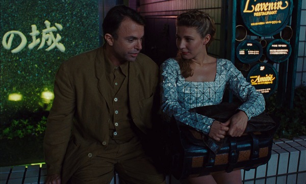 Prendre comme acquis l’aspect « double » du film constitue peut-être la porte d’entrée idéale pour mieux l’appréhender. A l’image de sa magnifique héroïne passant d’une perruque brune à une flamboyante chevelure blonde, le film adopte un double mouvement narratif, l’un accéléré, l’autre ralenti, avec une césure brutale en plein milieu qui justifie en soi le changement de rythme : la destruction par une arme nucléaire américaine d’un satellite indien incontrôlable en orbite autour de la Terre nourrit ici l’angoisse d’un champ magnétique capable de détruire les mémoires d’ordinateurs et de renvoyer l’humanité à son état le plus archaïque. C’est là le point de bascule du scénario, le passage d’une humanité qui allait jusqu’ici « très vite » et qui ira désormais « plus lentement ». C’est une sorte de « pli » qui rabat tout à coup le film sur lui-même, qui force à relire ses péripéties vécues sous un angle plus intériorisé, bref qui invite à une nouvelle réinterprétation du monde sous l’effet de la « rupture ». Il nous faut dès lors revenir sur l’avant et l’après. L’avant, c’est le trajet de Claire Tourneur (Solveig Dommartin, coscénariste et ex-compagne de Wenders), alors lancée dans une folle course-poursuite autour de la planète. D’une soirée décadente à Venise jusqu’à des retrouvailles conjugales à Paris, d’un engagement de détective à Berlin jusqu’à une traque sur les collines de Lisbonne, d’une investigation policière en plein Moscou jusqu’à une remémoration du massacre de Tian’anmen à Pékin, d’une pause zen chez un vieux guérisseur de Kyoto jusqu’à une visite familiale au détour d’une rue de San Francisco, l’épicentre du voyage porte le nom de Trevor McPhee (William Hurt), mystérieux voyageur américain traqué non seulement par Claire (qui est tombée amoureuse de lui) mais aussi par le FBI, la CIA et des chasseurs de primes. Tout au long de ce trajet polardeux viennent alors se greffer d’autres personnages : Eugene Fitzpatrick (Sam Neill), écrivain et ex-compagnon de Claire ; Phillip Winter (Rüdiger Vogler), détective privé aux motifs louches ; Chico et Raymond (Chick Ortega et Eddy Mitchell), deux gangsters en possession du butin d’un hold-up niçois, etc…