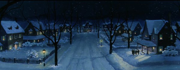 En ce sens, on notera un travail graphique peut-être moins expérimental que sur d’autres long-métrages du studio. Dans sa version cinémascope, la mise en scène revendique un certain académisme en laissant les personnages évoluer dans ses somptueux cadrages. Une animation d’une extrême rigueur soit dit en passant. Contrairement à Bambi et ses animaux de la forêt, le film met en avant des créatures que nous côtoyons tous les jours et en conséquence dont nous cernons mieux les attitudes. Un travail brillamment accompli assurant cette impression d’assister à une réalité transcendée par la magie du processus d’animation. Toutefois, le film exploite également certains aspects propres à l’animation même si plus discrets. En l’occurrence, les passages les plus ambitieux visuellement se jouent principalement sur des effets de transition. Un exemple époustouflant est la scène où le clochard explique à Lady ce que signifiera pour elle la naissance du bébé. Sans aucune rupture dans l’animation du personnage, on la voit évoluer dans différents environnements se fondant les uns sur les autres. Une autre splendide démonstration est la conclusion de la célèbre séquence sur la chanson Bella Note. Nous sommes dans un parc illuminé par la lune où les amoureux se rassemblent. L’image s’assombrit laissant augurer un classique fondu au noir. Mais il s’avère que le ciel reste éclairé. Lorsque la colorimétrie change pour passer de la lumière de la lune à celle du soleil, le décor réapparaît mais a changé. En un seul plan, nous venons d’assister à une transition temporelle. Serait-ce une manière de rappeler que les questionnements d’hier reste ceux d’aujourd’hui ?