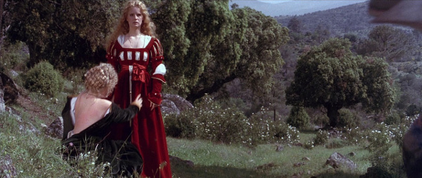 Comme toujours chez Verhoeven, c’est la figure féminine, ici vicieuse par nature, qui devient l’épicentre de la dramaturgie et influe sur le déroulement de l’action. Jouée par une Jennifer Jason Leigh sidérante de naturel et de perversité dissimulée, Agnes s’éloigne de l’image rassurante de la jeune aristocrate ingénue dès qu’elle se retrouve prisonnière de Martin et de son affreuse bande de coupe-jarrets. Inauguré par une scène de viol collectif d’une rare crudité, le chemin de martyr que l’on pourrait alors envisager pour elle prend étrangement une autre tournure : durant cet acte abominable où Martin use de son sexe pour réaffirmer sa bestialité auprès de ses hommes (« Voyons si cet ange saigne ! »), la voilà qui contre-attaque en déviant du statut de victime vers celui de nymphomane manipulatrice (« Si tu crois que tu peux me faire mal, tu te trompes, j’aime ça ! C’est moi qui vais te prendre ! »). Outre cette idée de retourner les symboles vers leur exact contraire (ici, la vierge innocente devient la putain perverse), on remarquera que le film abat toute certitude sur les motivations des personnages, Agnes en tête. Qui est-elle réellement ? Elle a beau être sexuellement inexpérimentée, elle aura tôt fait d’utiliser son corps comme d’une arme ou d’un instrument de survie. En allant plus loin, on pourrait aussi voir dans sa déclaration durant le viol une sorte de proféminisme poussé à l’extrême : ne pas donner à son violeur la satisfaction de la considérer comme une victime souillée, et prendre l’ascendant sur lui. Même son désir pour Martin s’étoffe d’une pointe d’ambiguïté, tant on sent qu’il s’agit d’une diversion pour empêcher les autres de la violer, sans compter que la découverte de la sexualité se pare d’une pointe de jalousie (voir la célèbre scène de sexe au bain, où chaque ligne de dialogue installe un doute sur la vraie motivation d’Agnes).