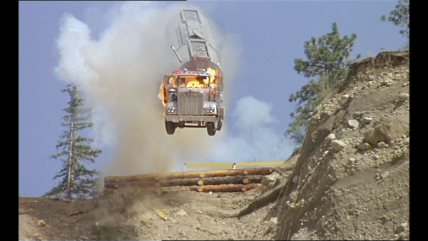 Il s’agit d’un exemple d’une mise en image extrêmement travaillée. Repoussant sur le papier le concept de manipulation judiciaire, Corneau tente également de faire valoir ses talents de metteurs en scène en incluant nombre d’idées visuelles chargées de traduire la complexité des enjeux. L’utilisation d’un travelling compensé est ainsi un outil pour mettre l’accent sur la prise de décision du héros. Mais on retiendra surtout la grande habileté avec laquelle les personnages sont situés au cœur des décors. Une chambre dépouillée et en cours de rénovation traduit le désespoir d’un personnage incapable d’avancer. Un plan où le héros marche dans le faible espacement entre deux camions garés traduit la voie sans alternative qu’il prend. De même, la dimension tragique est symbolisée par le motif du cercle que Corneau insère le plus possible dans ses images. Il minimise les dialogues (le héros sera d’ailleurs muet dans tout le dernier acte) et voit jusqu’où il est capable d’aller dans la traduction visuelle d’une intrigue. Inutile de dire que cela permet de décupler l’intérêt cérébral du film où le sens de chaque plan peut être analysé avec passion. On peut également se contenter du plaisir cinéphilique de voir Corneau exprimer sa culture. Si il soigne à ce point narration et mise en scène, c’est parce qu’il réfléchit à La Menace comme une œuvre totale sur le cinéma. La structure même de l’histoire exprime cette idée en commençant comme un drame passionnel, se poursuivant en thriller policier et se concluant dans une course-poursuite à la Duel. Le final est d’ailleurs l’expression ultime d’un fantasme de cinéphile français. On sent clairement le bonheur de Corneau à déménager sa production en Amérique et à filmer ces grands espaces où s’affrontent de gigantesques monstres mécaniques.
