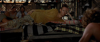 Le pouvoir de la plage est moins en cause que ce qu’elle représente pour ses occupants. Ce paradis est pour être exact leur paradis. A leurs yeux, ils doivent absolument le protéger. Quand la plage fut découverte, les fondateurs du village ont déjà vu comment des lieux d’exception ont été souillés et banalisés par la fréquentation intempestive de touristes. Cela pose le premier jalon de l’hypocrisie de cette station balnéaire pour ceux qui n’aiment pas les stations balnéaires. La plage se présente comme une société de partage et de plaisance mais elle prône un statut de privilégié aussi arrogant qu’égoïste. Le personnage principal Richard n’y échappe pas et se trouve être un narrateur peu fiable. Ainsi est-il apte à détailler les petits jeux futiles inventés lors de son séjour alors qu’il se montre tout bonnement incapable de remettre un nom sur certains personnages. Ce sentiment de supériorité sur le commun des mortels n’est qu’une forme d’aliénation. Se détournant du camp au cours du récit, Richard traitera ces anciens compagnons avec le même mépris qu’il réserve au reste du monde. Isolé, il trouvera une existence qu’il juge bien plus en accord avec la nature que la norme du village. Une existence donc bien meilleure même s’il est flirte avec la pure démence. Plus tôt, il aura été indiqué comment cette prétendue suprématie fait accepter aux habitants une loi dure et sans échappatoire. Evidemment, cette loi ne se fait pas sentir comme telle. Bien que se définissant comme chef, Sal ne revendique aucunement cette responsabilité. Elle impose ce statut de lui-même et sans force par sa capacité à manipuler chacun. En l’incarnant à l’écran, l’actrice Tilda Swinton la considérera comme un mélange de stalinisme et d’aromathérapie. Un cocktail pertinent car c’est bien d’une main de fer qu’elle dicte la conduite du camp en employant des atours si enivrants que la logique de ses « ordres » n’est pas remise en cause.