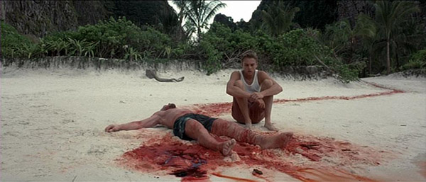 Ce désagréable reflet pourrait être entériné par l’arrivée imminente d’une nouvelle troupe de routards. En effet, avant de partir pour l’île, Richard craignait ce qu’il trouverait là-bas et laissa une copie de la carte à quelques personnes par sécurité. Hors des événements, son geste est déjà mal accepté puisqu’il a brisé le secret du domaine. Cela pourrait causer sa destruction par sa banalisation exposée plus haut, voir une fin plus immédiate. Car la communauté n’est pas seule sur l’île. Sur l’autre versant habitent les autochtones qui exercent la respectable profession de trafiquants de drogue. Ils acceptent la présence des étrangers sous réserve qu’ils ne se mêlent pas de leurs affaires et qu’aucune personne supplémentaire ne vienne sur l’île. La conjoncture est donc délicate et l’état du camp débouche sur un risque supplémentaire. Etant donné sa décrépitude, les nouveaux arrivants ne verraient aucunement dedans le paradis promis par les rumeurs. Leur déception giclerait à la figure des habitants et ceux-ci terniraient leurs visions idylliques du lieu. C’est ce qui se produira… de la plus abominable des manières. Attrapés par les trafiquants de drogue, ils seront tués dans des circonstances demeurant floues (était-ce une exécution ou un sinistre accident comme choisira de l’illustrer le film ?). Dans tous les cas, les thaïlandais amènent leurs dépouilles au camp et repartiront après un simple avertissement. Le geste rappelle à tous ses routards qu’ils n’ont jamais été maîtres des lieux mais juste des hôtes tolérés. S’ils pensaient que le statut de privilégiés leur revenait de droit, ils ne peuvent désormais que constater qu’il n’est qu’un cadeau et que celui-ci peut être repris. Dès cet instant, il est impossible de ne plus considérer à quel point leur consommation de leur bonheur passe par le mensonge et l’horreur. Incapables d’assumer ce fardeau, ils connaissent une ultime régression vers la barbarie. Avec les moyens du bord, ils se mettent à déchiqueter les corps symbolisant cette trop douloureuse révélation et finissent par mutiler Richard qu’ils jugent responsable de ce foutoir.