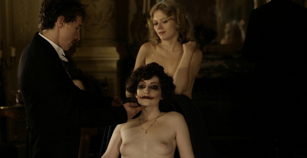 Alors, évidemment, ce qui tend à effriter cette image d’indépendance véhiculée par les héroïnes vient de la perversion des fantasmes, menant au sadisme puis à la réduction de la femme à un pur objet sexuel, réceptacle de toutes les perversités. Le fait que le cinéaste débute son film par une scène aussi cruelle installe d’emblée une menace fantomatique sur un univers menacé de disparition. Ici, la plupart des clients sont pourtant courtois, aimables, amuseurs, touchants et respectueux, très éloignés des figures menaçantes que l’on pouvait supposer. Ils sont eux aussi menacés d’extinction. Et pour tenter de sauver les apparences, les fantasmes s’imposent vite : devenue domestique suite à son agression, la prostituée mutilée (Alice Barnole), surnommée « La femme qui rit » à cause de son faciès évoquant le Joker de Batman, se voit contrainte de participer à des soirées privées, organisées par l’élite. Les dès sont alors jetés : un grotesque rite sexuel destiné à la pure excitation des sens, un décor qui suinte le luxe, le masque utilisé comme outil de désincarnation, une aristocratie globalement rajeunie (parmi laquelle on reconnaîtra Bertrand Bonello !), le bouleversant Adagio de Mozart utilisé comme contrepoint ironique et tragique, et surtout, une prostituée de porcelaine dont l’excitation des clients naît de la contemplation de ses mutilations. A travers cette révélation d’une nouvelle forme d’excitation sexuelle reliée à la douleur (très cronenbergien, tout ça), tout concourt à signer la fin d’un monde de fantasmes au profit d’un nouveau, chargé en rites grossièrement lyriques, à l’image de celle qui habite les derniers nanars érotiques de Jean-Claude Brisseau. Sauf que, si Brisseau filmait le sexe en se vautrant dans la naïveté et le bavardage poids lourd, Bonello garde sans cesse l’équilibre entre la beauté et le grotesque, entre la pureté et l’obscénité, entre la magnificence et la déchéance. L’émotion naît alors de ce contraste, diffus et jamais appuyé.