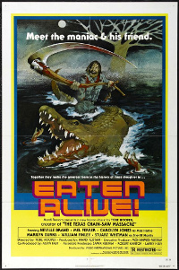 La carrière de Tobe Hooper ressemble à une gigantesque méprise. Dans l’inconscient collectif, l’homme restera juste le responsable d’un monument du cinéma gore : Massacre à la Tronçonneuse. Outre une problématique générationnelle qui risque de devenir fort gênante avec le temps (beaucoup de jeunes spectateurs ne connaissent le titre que par le sympathique remake de Marcus Nispel et ne savent pas qu’il y a un film original derrière celui-ci), l’affirmation est erronée. Tout d’abord parce que Massacre à la Tronçonneuse n’est pas un film foncièrement rattachable à la catégorie du gore. Il est glauque et dérangeant certes mais pas spécialement gore. Ensuite parce qu’au milieu d’une quantité de films effectivement navrants (Lifeforce, Combustion spontanée, Mortuary on en passe et des meilleurs), Hooper a quand même réussi à commettre des films remarquables. Sa carrière contient ainsi au moins un titre phare des années quatre-vingt avec le culte Poltergeist. Cela dit, on retombe dans un autre souci de mésentente puisqu’il reste encore impossible aujourd’hui d’attribuer la paternité du film. Les informations contradictoires fusent, allouant parfois la réussite du film naturellement à Hooper et d’autres fois à Steven Spielberg, producteur apparemment très interventionniste dans l’entreprise. Si certaines données sont avérées (Spielberg a énormément préparé le film en amont, le compositeur Jerry Goldsmith n’a jamais travaillé avec Hooper), il demeure un mystère qui risque de n’être jamais dissout. Difficile en conséquence de considérer Poltergeist comme une pure création d’Hooper. On se posera moins de soucis avec le cas de Eaten alive, troisième long-métrage du réalisateur après le méconnu Eggshells et son mythique massacre texan.