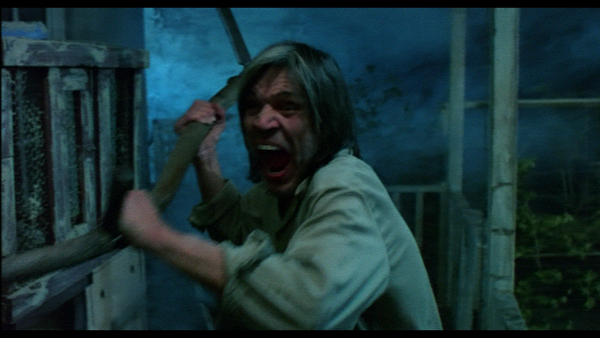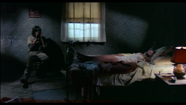 Logiquement, on ne saura rien de se dernier. Tout juste pourra-t-on comprendre au milieu de ses marmonnements qu’il doit être un vétéran de la guerre du Vietnam. A l’inverse de la famille de Massacre à la tronçonneuse, le personnage n’est pas franchement là pour se poser comme le produit d’une Amérique dégénérée. Il est juste cet animal étrange au comportement imperceptible semblant à la fois enchanté et terrifié par les atrocités qu’il commet (l’interprétation de Neville Brand est parfaite en ce sens). Il n’y a donc pas d’explication à ses agissements, si ce n’est cet instinct animal. Bien qu’il tienne un motel censé accueillir les voyageurs, le dénommé Judd ressemble à un animal qui lutte pour la protection de son territoire. Alors que les choses commencent à sentir le roussi pour lui, on le voit recroquevillé dans son salon. La femme qu’il a ligotée se démène en cognant le battant du lit contre le mur, un couple fait l’amour au rez-de-chaussée et une fillette cachée dans les combles exprime pleinement sa panique. Judd se sent complètement oppressé par cette invasion de son environnement. Cela expliquerait son animosité particulière envers Buck. Si il n’est pas le seul personnage à être assimilé à un animal (le père de famille joué par William Finley aboiera comme un chien face aux humiliations de sa femme), Buck est absolument rabaissé au rang de bête en raison de son appétit sexuel. Bien qu’il ne soit pas de la même race, il est un véritable égal animalier à Judd et donc une menace évidente pour lui. Lorsque Judd affirmera sa domination sur Buck en le jetant en pâture au crocodile, il ne pourra s’empêcher de lâcher « il mange de tout… même toi ! ». Il rappelle par là à quel point il est naturel pour les animaux de se dévorer entre eux.