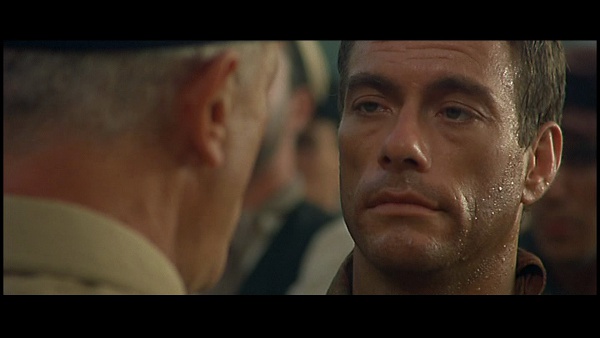 Une aventure intérieure également compliquée par un scénario peu à même de restituer la puissance des histoires de David Lean. Au vu de ses précédents travaux, on sait très bien que Lettich n’est pas un scénariste adepte de la subtilité et de la finesse d’esprit. Ce qu’il démontre par un empilement de clichés comme les seconds couteaux entourant le héros (l’italien avec sa fiancée au pays, l’aristocrate anglais, l’afro-américain fuyant un contexte social houleux, la brute épaisse mais qui a un bon fond). Des clichés s’agglutinant autour d’une histoire mal fagotée peinant à trouver une manière de relater son histoire. En ce sens, l’aventure que vivra le héros dans le désert marocain ne met aucunement en relief son évolution. Le script aligne l’exécution de moments de bravoure démontrant sa noblesse d’âme mais ne montre guère de changements dans le personnage (pour ne pas dire aucun). L’interprétation de Van Damme est également en cause. Certainement pas très préoccupé par la direction d’acteurs, MacDonald semble laisser faire le bonhomme. Ce dernier met alors en œuvre un jeu tout en intériorité mais qu’il est incapable de soutenir sans quelqu’un pour l’épauler. Résultat : l’acteur semble constamment à l’ouest et dépourvu de sentiments. Lorsqu’un supérieur lui dit qu’il y a du brouillard dans ses yeux, ce n’est vraiment pas des paroles en l’air.