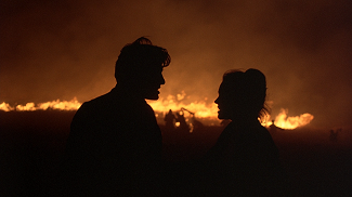 Parmi ces plans de nature qui zèbrent le montage à dose plus que régulière, ne nous le cachons pas, c’est bien la faune animale qui a le plus voix au chapitre dans Les Moissons du ciel. Malick en fait son héroïne secrète au détour de quelques plans furtifs : une sauterelle qui grimpe sur un épi de blé, un coq et un lapin effrayés par les moissonneuses, une grenouille nichée entre d’épaisses pierres, un équidé qui se nourrit les pattes dans la vase, etc… Ces plans-là, comme souvent chez Malick, ont une double vocation : témoigner d’une forme de vie prenant racine au même endroit selon des échelles variables, mais aussi user du contraste alimenté par le cosmos ambiant afin de mettre en perspective l’ambivalence de l’être humain. L’invasion des sauterelles qui clôt le chapitre des moissons texanes est ainsi le point d’orgue de cette démarche. On laissera la liberté à chacun d’y voir une relecture biblique des dix plaies d’Egypte ou une réponse naturelle de la nature face à l’invasion humaine, mais les choix de montage invitent tout de même à rester plus terre-à-terre. En effet, l’événement est activé suite aux premiers soupçons du fermier, lequel a du mal à contenir ses tremblements lorsqu’il voit de loin un geste tendre d’adieu de Bill à Abby qu’il assimile à une preuve d’amour (c’est à ce moment-là que le bruit des sauterelles investit la bande-son). Par la suite, le feu destructeur devient celui de la jalousie et de la rancœur, son moteur humain le laisse se propager dans les champs jusqu’à ce qu’il ne reste plus rien, et la colère achève de se retourner fatalement vers celui qui l’a activée.