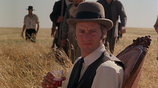 Bien sûr, parler de « fuite » refait là encore penser à La Balade sauvage, et il est vrai que la dernière demi-heure des Moissons du ciel semble rejouer un schéma identique en plaçant un couple dans une position de marginalité funeste, avec cette idée que le marteau de l’autorité revient toujours frapper ceux qui ont fait le choix de sortir des clous. Toujours ce point de vue frontal et désenchanté sur l’Amérique des origines, sur sa violence native, sur ses grands espaces non-domesticables dans lesquels s’active l’écrasement de son propre peuple, que n’aurait pas renié un certain Michael Cimino. On ne cite d’ailleurs pas le cinéaste de Voyage au bout de l’enfer et de La Porte du paradis pour faire joli, puisque Les Moissons du ciel démarre comme le premier et se poursuit comme le second (avec qui il partage en outre un titre original relativement voisin !). De cette sale et sombre aciérie urbaine de Chicago jusqu’aux vastes plaines rurales du Texas se dessine ainsi une vision sans concessions du monde ouvrier et de la brutalité des rapports de classe. Une fois l’entrée au domaine effectuée en passant sous la « porte du paradis » (une arche sans aucune barrière autour !), le jardin d’Eden tant espéré va rapidement se révéler illusoire. Quand bien même la vie sur place offre à la communauté de beaux signes d’harmonie (danse autour du feu, messe au coucher du soleil, golf dans les plaines, chasse à la perdrix, numéro de claquettes sur fond d’harmonica…), la tension a tôt fait de s’installer entre les travailleurs, sous l’effet d’un travail pénible et de superviseurs méprisants. Quant aux vastes paysages originels dans lesquels se déroule l’action, leur apparente majesté ne cachera pas bien longtemps un envers bien sombre. L’humanité ne cesse de laisser son empreinte destructrice sur les champs de blé – celui qui moissonne se contente de récolter tout ce que la machine a ravagé et transformé. Comme dans La Balade sauvage, le seul espoir, là encore, consiste à suivre les rails de la marginalité, à contrevenir aux règles de sa propre classe (dominante ou pas), à se placer en décalage par rapport au système tout entier, à faire l’expérience intime et subjective du monde, parfois au péril de sa propre vie.