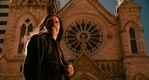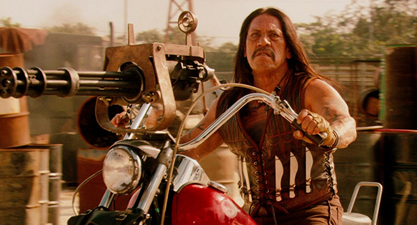 Ce n’est pas tant une question d’évolution de point de vue, mais il est certain que la redécouverte du très foiré Planète Terreur a pesé très lourd dans la balance. Calé (recalé ?) en amuse-gueule du segment signé par Robert Rodriguez pour le projet Grindhouse (lui-même supervisé en duo avec l’ami Quentin Tarantino), Machete n’était alors que le désopilant trailer d’une apparente série Z à deux pesos, intégré dans une anthologie du cinoche bis en compagnie d’autres petits extraits de navets sanguinolents et tout aussi fictifs que lui. Sauf que voilà, la bande-annonce ayant eu un succès monstrueux auprès de la frange la plus déviante de la galaxie geek, il n’en fallait pas moins pour que le gringo Rodriguez ait soudain envie de donner chair à cet énième vengeur mexicain – il avouait par ailleurs en avoir eu l’idée sur le tournage de Desperado quinze ans plus tôt. Le doute régnait quand même : quand on voit ce qu’une invasion de morts-vivants avait pu donner entre ses mains (en gros une purée de clichés référentiels et d’idées folles mal canalisées), fallait-il laisser Rodriguez pousser le détournement de nanar au niveau 2, c’est-à-dire en réactualisant un gag de deux minutes à l’échelle d’un long-métrage entier ? Et si oui, allait-on se retrouver contraint de ressortir le vieil adage « Les blagues les plus courtes sont les meilleures » en cas de déception ? Un rapide retour en arrière sur la filmo du cinéaste tex-mex allait être d’une grande aide pour choisir le bon aiguillage.