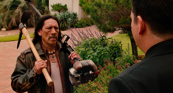 On pourrait penser au premier abord que le plus dur serait de trouver ce qui rend ce Machete prodigieusement drôle, mais la raison est toute simple, et elle tient en deux mots : Danny Trejo. Cette gueule cassée, regard transperçant et musculature de dieu grec, cousin germain de Rodriguez et ancien taulard junkie, avait jusqu’ici traîné sa bosse en jouant des rôles « adaptés » dans un grand nombre de péloches pour Michael Mann (Heat), Rob Zombie (The Devil’s Rejects), Gregg Araki (Smiley Face) ou encore Simon West (l’affreux « Juanito 23 » des Ailes de l’enfer !). Première surprise : devenir enfin le héros d’un film d’action cousu sur mesure pour lui permet paradoxalement à Trejo de larguer sa longue collection de brutes sadiques pour embrasser un génie comique dont lui-même n’était sans doute pas conscient. Concrètement, on dira que le personnage de Machete tient autant de Black Dynamite que de Jason Voorhees. Du premier, il conserve l’idée d’un personnage à la lisière du mythe et du ringard, singeant les standards du cinoche bis (la Blaxploitation laisse ici la place au nanar tex-mex) avec un sérieux imperturbable d’où peut facilement s’extraire le plus bidonnant des décalages. Du second, il réactive la posture de la machine à tuer gorillesque qui avance sans dire un mot (ou alors très peu) avec sa machette aiguisée, histoire de s’en tenir à un objectif basique (zigouiller le plus de crétins possibles dans un déluge de gore qui pique) et de régler les problèmes en donnant l’impression de n’y prêter aucune attention. Ajoutez à tout cela un joli art du bavardage à la troisième personne, en soi générateur de répliques cultes à la pelle (« Machete n’envoie pas de textos », « Machete trouve des preuves », « Machete improvise »…), et l’affaire est dans le sac.