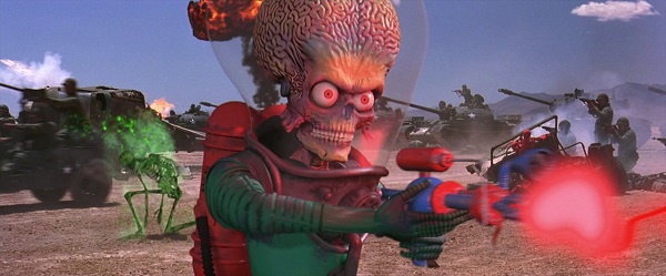 Mars Attacks ! se voulait-il vraiment l’anti-Independence Day ? Pas par choix délibéré – le hasard a voulu que les deux films soient tournés en simultané et sortent la même année – mais par effet de bord, cela va de soi. On a beau considérer que le triomphe planétaire – et les valeurs patriotiques – du film de Roland Emmerich devrait suffire à expliquer le flop de celui de Tim Burton au box-office US, on est très sûrement en-dessous de la vérité. Parce qu’en l’occurrence, les fortes variations entre les deux films tiennent aux signes d’un ton satirique qu’une certaine Amérique, trop peu adepte de l’autodérision dès lors qu’on cible ses valeurs fondatrices, rechignerait à tolérer. En gros, dans le cadre d’une invasion du « monde libre » (on ajoute les guillemets par pure provocation) par une race extraterrestre très agressive, osez caractériser l’armée en administration aussi incompétente que débordée et non en force motrice de la contre-attaque, le couple présidentiel en tandem échappé de Madame est servie et non en facteur d’identification, les scientifiques en grands neuneus aux théories vaseuses et non en geeks ultra-cool à la Jeff Goldblum, et c’est le bide assuré. En optant aussi bien pour une satire sociale des valeurs américaines que pour une parodie des films de science-fiction des années 50, Tim Burton prenait donc de gros risques. D’autant que, chose surprenante, la Warner alla jusqu’à débourser pas moins de 70 millions de dollars pour un film ne visant qu’à tourner en dérision leur propre fonds de commerce. La raison ? Très simple, en réalité : tous les acteurs engagés – un large parterre de stars populaires qui file le vertige – ne réclamaient qu’à se joindre à Tim Burton dans son entreprise de saccage. Un cas qui rappelle assez bien celui de 1941 : à l’instar d’un Steven Spielberg jouissant de très gros moyens pour passer la psychose ricaine post-Pearl Harbor sous les chaînes d’un char d’assaut incontrôlable, Burton s’en donne à cœur joie dans le dynamitage hystérique de tout ce que l’Oncle Sam peut compter d’icônes, de conventions, d’étroitesse d’esprit et (surtout) de manque d’humour. Parce qu’ici, le massacre n’est pas tant affaire de méchanceté que de plaisir.