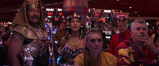 Il faudrait bien plus qu’un paragraphe pour rendre justice aux spécimens de la diversité yankee que Burton place ici en cobayes consentants de son jeu de massacre. Histoire de bien poser les bases de sa démarche, le cinéaste déroule une longue introduction d’au moins trois quarts d’heure, sorte de narration en corde à linge qui épingle chaque caractère/enjeu tout au long d’un fil scénaristique avec lequel le film s’acharnera ensuite à faire le plus de nœuds possibles avec un sourire de crâneur. Et bien sûr, tout ceci fait aussi office d’amorce de tout ce que Burton va lâcher ensuite en matière de piques satiriques et de missiles outranciers. En vrac : un couple présidentiel (Jack Nicholson et Glenn Close) qui meuble la Maison-Blanche plus qu’il ne la dirige, un milliardaire roublard (encore Jack Nicholson) qui enfile les manigances pour faire émerger son propre casino à Las Vegas, son ex-alcoolo d’épouse (Annette Bening) qui vire à la baba-cool über-timbrée, un couple de présentateurs TV (Michael J. Fox et Sarah Jessica Parker) à fond dans la vanité et l’égocentrisme, des conseillers militaires tantôt bellicistes (Rod Steiger) tantôt pacifistes (Paul Winfield), un porte-parole politique très porté sur les tapineuses (Martin Short), des scientifiques trop intellos et prétentieux (Pierce Brosnan et Jerzy Skolimowski) pour croire à une coexistence pacifique ou pour traduire correctement une langue inconnue, une famille de culs-terreux du Kansas (dont Joe Don Baker et Jack Black), une mamie zinzin qui s’occupe d’un chat empaillé (Sylvia Sidney), un joueur de casino bling-bling (Danny DeVito), on en passe et des meilleurs… Tant de spécimens d’Américains cinglés que Burton raccorde par des valeurs érigées en étendard. D’abord la télé, soit exploitée par ceux qui en tirent une image déformée et valorisante d’eux-mêmes, soit défendue les armes à la main par ceux qui s’en gavent à longueur de journée. Ensuite le mauvais goût, ici matérialisé par un Las Vegas surpeuplé d’escrocs, de marchands et d’idéalistes à deux de QI. Enfin la perception du groupe, sinon de la foule, comme un ensemble sujet à la déficience tous azimuts – les bouseux comme les puissants de ce monde en prennent ici autant plein les dents que les figures consensuelles et non masquées de Batman, le défi.