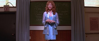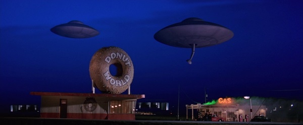 Cela dit, tout au long de cette invasion toujours plus ravageuse, on se surprend très souvent à guetter les micro-détails dans chaque plan magistralement composé par Burton et chaque effet de montage opéré à telle ou telle articulation du récit. De façon très anecdotique, cela peut tenir dans un raccord de plan a priori gratuit (pourquoi avoir casé ce plan spatial de cinq secondes sur les soucoupes volantes entre deux scènes décorrélées ?), dans un choix de casting qui interpelle (savoureuse auto-parodie par Joe Don Baker du registre beauf-texan qui fit sa réputation), voire même dans la simple démarche d’un acteur (celle, ondoyante, de la Martienne jouée par Lisa Marie frise ici le pastiche de celle des grandes actrices hollywoodiennes). De façon plus large, c’est que Burton joue sur les symboles, inverse et transgresse leur logique, en use même pour tisser des lectures subversives. L’exemple le plus parlant est celui qui déclenche les festivités : une foutue colombe lancée dans les airs par un hippie débile à la suite d’une traduction erronée. Quelques jours après cette rencontre du troisième type plus foireuse tu meurs, les Martiens iront jusqu’à se lancer à l’attaque de la Maison-Blanche après avoir aperçu un aigle sur son logo. Colombes et aigles… ça ne vous dit rien ? Fastoche : l’Amérique est déjà divisée entre ces deux types d’oiseaux, les pacifistes niais d’un côté, les bellicistes voraces de l’autre. Chacun n’est ici qu’un piaf destiné à finir en squelette cramoisi (rouge ou vert, ça dépend – Burton persiste ici à saloper l’esprit de Noël en faisant de ses deux couleurs des signes d’effroi) sous les effets du pistolet désintégrateur des Martiens. Et plus les conséquences des dégâts sont déformées parce que grossies jusqu’à l’outrance, plus le rire et la moquerie gagnent en force, surtout quand la télévision se fait le relais du désastre.