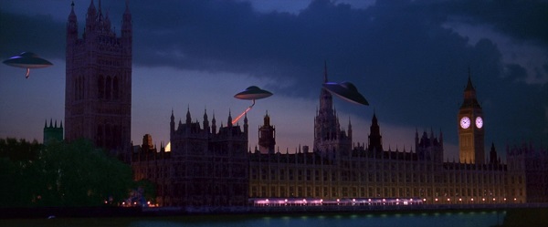Tiens, la télé, remettons-en une couche là-dessus… On l’évoquait plus haut comme outil de communication ou de décervelage généralisé, et ce n’est pourtant que la partie émergée de l’iceberg. Le film va infiniment plus loin en illustrant par le détournement un état des lieux commun de la philosophie ricaine, à savoir la mise en scène de la paix comme de la guerre, et ce par le biais d’un politiquement correct qui assèche toute réflexion (grand moment d’un journaliste puritain qui questionne la sexualité des Martiens !). C’est ce que cherchent aussi bien le Président et son staff d’intellos confits (ceux qui veulent mettre la paix en spectacle) que tous les bellicistes frappadingues qui gravitent autour d’eux (ceux qui veulent mettre la guerre nucléaire en branle). Pas de bol pour chacun d’eux : les Martiens ont toujours une longueur d’avance sur eux, pour la simple raison qu’à l’instar des envahisseurs de La Guerre des mondes, ils ont pris le temps d’assimiler les ruses terriennes – surtout tout ce qui relève de la stratégie politique – et que le désir de foutre en l’air chaque recoin de la planète bleue rejoint pour eux le fait de zapper à volonté sur une télévision (dès que ça n’est plus amusant, on passe à autre chose). Une courte scène du film en donne d’ailleurs l’illustration littérale : paisiblement assis devant son écran dans sa soucoupe volante, l’empereur martien observe les dégâts causés dans la capitale japonaise (avec la résurgence de ce cher Godzilla qui se met à tout casser dans Tokyo !), et préfère alors changer de chaîne pour se taper un banal épisode de Shérif fais-moi peur !