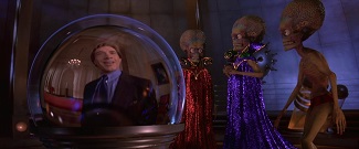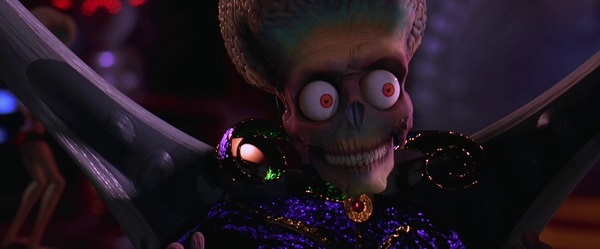Au vu de l’éternelle fascination de Tim Burton pour les freaks (en particulier) et pour la perception de tout ce qui est « différent » (en général), il paraîtrait logique que les Martiens soient ici les dépositaires de son propre point de vue. Or, rien n’est moins sûr. Déjà, en matière de pure caractérisation, ces créatures ne font que décliner – certes sous un angle ouvertement comique – l’éternel cliché du petit homme vert tel que la bande dessinée et le 7ème Art ont pu l’imposer. En gros, rien de moins ici que des bipèdes à la cervelle disproportionnée, dessinés en allusion directe aux aliens des Survivants de l’infini, et sur lesquels Burton plaque ses idées loufoques : ses Martiens causent comme Donald Duck, bavent devant Playboy, ne supportent pas les piafs et les montres, et n’ont pour seule faille fatale que la musique country (en l’occurrence le yodel très accentué de Slim Whitman dans la chanson Indian Love Call). De même que la planète Mars, ici visualisée en vingt secondes chrono lors des plans inauguraux du film, se limite à un relief peint en rouge vermillon et recouvert de stalagmites en carton-pâte. En réalité, la déformation vient ici moins de la nature des Martiens que de leur comportement déviant et des expériences farfelues qu’ils pratiquent ici (vision sidérante à la Salvador Dali d’une humaine qui se retrouve avec la tête greffée sur le corps de son chihuahua !). Comme nous sommes chez l’auteur d’Edward aux mains d’argent, c’est la normalité qui finit toujours par devenir source d’anormalité, et vice versa.