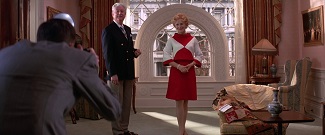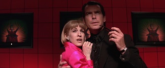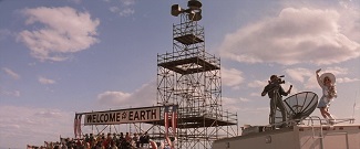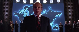 Plus globalement, le film case ici et là de petites vignettes planétaires censées illustrer en quoi les attaques des Martiens ont tout d’une mise en scène ricaneuse. D’un côté, on essaie moins de raser la globalité d’une grande ville avec un gros rayon laser façon Independence Day que de cibler les constructions à connotation phallique ou sexuelle (le Big Ben, la tour Eiffel, l’obélisque de Washington, la pyramide de Las Vegas, les coupoles du Taj Mahal, un building-casino coiffé d’un toit-nichon…). De l’autre, on réutilise d’autres « créations » pour en trahir le sens premier : les statues moais de l’île de Pâques deviennent des quilles de bowling, les visages sculptés du Mont Rushmore sont soumis au palimpseste, et même un simple missile nucléaire se retrouve ici fumé comme s’il s’agissait d’un cigare ! Et histoire de revenir à quelque chose de plus pragmatique, voir les Martiens foutre le feu au Capitole provoque ici l’effroi du cercle présidentiel et l’hilarité d’une grand-mère dans un hospice – tout ce qui sort du tube cathodique ne peut plus être lu autrement que par le filtre primaire de la série B (on flippe ou on se marre). Au fond, la planète est devenue elle-même une télévision, et Burton en prend acte par une approche très métatextuelle, zappant à loisir d’un coin à l’autre du globe parce que tout n’est ici qu’une suite de sketchs à mater, un spectacle pop-corn joyeusement corrosif dont il jubile à nous faire déguster l’anthologie. Avec, en guise de cerise sur le gâteau, des personnages qui ne tardent jamais à devenir eux-mêmes le sujet et le témoin de leur propre spectacle. Que le chanteur Tom Jones joue ici son propre rôle avec une pointe d’auto-parodie s’avère moins parlant que ce court instant de l’intervention télévisée du Président onctueusement joué par Jack Nicholson : lorsque ce dernier prophétise un grand système solaire uni pour les Terriens et les Martiens (tout en citant Abraham Lincoln au passage sans lui demander son avis !), la seule réaction de moquerie (« Qu’est-ce qu’il raconte, ce con ? ») provient d’un milliardaire timbré joué par… Jack Nicholson lui-même !
