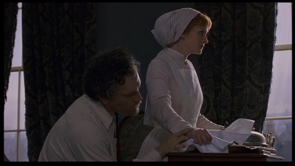 Outre l’optique féminine approchée, le choix de suivre l’histoire par les yeux d’une femme de chambre offre une proximité avec le personnage central permettant ainsi une meilleure étude de sa dualité. Une proximité qu’exploitaient complètement les versions antérieures du script avec une construction en quasi-huis clos. L’histoire se situait alors intégralement dans le manoir du docteur. Peu à l’aise avec cette conception claustrophobique, Frears demandera à tourner un peu plus le récit vers l’extérieur. Cela ne l’empêche pas de maintenir une impression d’enfermement. Bien qu’il considère que c’est un problème si le public ne retient du film que sa facture visuelle, l’esthétisme de Mary Reilly est d’une importance capitale pour le propos. Si Hampton a focalisé l’intrigue dans le manoir de Jekyll, c’est parce que celui-ci devient l’expression même de son cerveau. La maison est organisée en fonction de la position sociale de chacun, schématisant un homme se conformant aux strictes règles de son époque. L’apparence cohabite avec le fonctionnel mais tout est hiérarchisé avec rigueur et l’un ne doit pas empiéter sur l’autre. Du minuscule grenier où se repose la frêle Reilly au sombre laboratoire où Jekyll mène ses expériences interdites, aucun détail ne manque dans ce jeu mental.