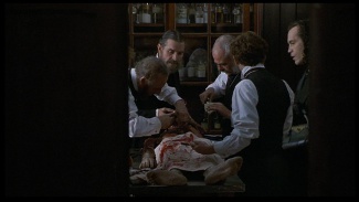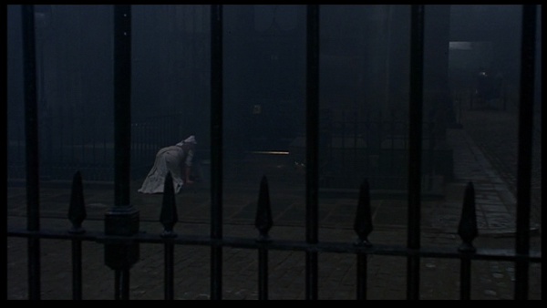 Le décor est donc primordial et cela n’est en rien gâché par l’aération réclamée par Frears. Il filme ses extérieurs de telle manière à maintenir la métaphore sur la psyché humaine. Les rares plans larges sont constamment enveloppés dans un brouillard synthétisant le flou de l’inconscient et le film est principalement fait de rues étroites devenant autant de circonvolutions d’un cerveau en proie à ses démons. Une scène importante voit le personnage titre accompagné Hyde dans des lieux où elle ne s’est jusqu’alors jamais aventurée. Il s’agit d’abattoir où s’étalent des quartiers de viandes fraichement découpés et d’un institut médical où elle assistera à une opération pour le moins barbare. Celle-ci dévoilée furtivement par le clappement d’une porte connote cette idée de s’avancer dans des aspects humains insoupçonnés, d’entrapercevoir un peu de son horreur. Le film s’ouvre après tout sur une caméra passant à travers des barreaux, invitant par là à pénétrer les méandres d’un esprit.