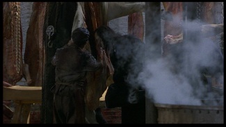 Le décor est donc primordial et cela n’est en rien gâché par l’aération réclamée par Frears. Il filme ses extérieurs de telle manière à maintenir la métaphore sur la psyché humaine. Les rares plans larges sont constamment enveloppés dans un brouillard synthétisant le flou de l’inconscient et le film est principalement fait de rues étroites devenant autant de circonvolutions d’un cerveau en proie à ses démons. Une scène importante voit le personnage titre accompagné Hyde dans des lieux où elle ne s’est jusqu’alors jamais aventurée. Il s’agit d’abattoir où s’étalent des quartiers de viandes fraichement découpés et d’un institut médical où elle assistera à une opération pour le moins barbare. Celle-ci dévoilée furtivement par le clappement d’une porte connote cette idée de s’avancer dans des aspects humains insoupçonnés, d’entrapercevoir un peu de son horreur. Le film s’ouvre après tout sur une caméra passant à travers des barreaux, invitant par là à pénétrer les méandres d’un esprit.