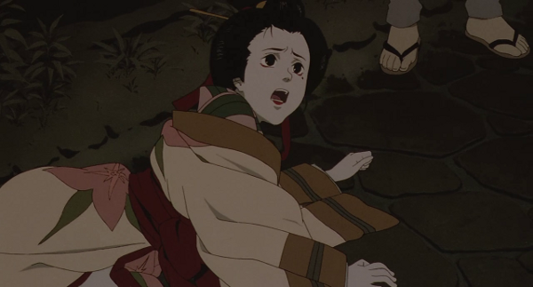 Bien sûr, l’élaboration d’un tel lien ne saurait se limiter au scénario du film, remarquablement écrit au demeurant. Comme toujours chez Satoshi Kon, l’expérience se veut extrêmement sensorielle. On est là dans le registre de l’évocation suscitée par l’image et de son pouvoir quant à véhiculer du sens. À ce titre, l’évolution de la mise en scène se fait, comme dans Perfect Blue, progressivement. Le réalisateur s’y emploie en premier lieu de manière simple, par le biais de la voix de Chiyoko narrant ce qui se passe à l’image. Il déstabilise ensuite légèrement son spectateur en faisant intervenir Genya et son cadreur dans le champ, quand bien même celui-ci investit les souvenirs de Chiyoko. Un choix qui impose un glissement tout en douceur du réel vers ce qui ne l’est plus, et qui trouve un sens à l’aune du talent d’orateur de la vieille femme. Celle-ci a été l’une des actrices les plus talentueuses de l’Histoire, sa raison d’être est de susciter les émotions par le jeu. Un talent tel qu’il transporte littéralement son auditoire au moment des faits contés, nous y compris. De même, le duo ne fait alors que l’écouter, il s’agit là des souvenirs de Chiyoko et ils ne peuvent interagir avec. En outre, seul le journaliste pourra se rendre actif à certains instants de la discussion. Il est le seul à partager avec l’actrice sa connaissance du cinéma : les rôles pour elle, la passion pour lui. Cependant, tout cela n’est qu’absolu. La confusion se fait sans prévenir, en dépit de la compréhension du procédé par le spectateur.