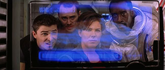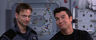 Le choix de la femme comme symbole de l’objet de recherche est ici à deux niveaux. D’une part, le motif de la « femme idéale » représenté au début de la mission par Phil Ohlmyer (Jerry O’Connell) semble d’abord friser la blague gratuite : on le voit utiliser des M&M’s pour dessiner en apesanteur la chaîne ADN de son idéal féminin, et une fois que Jim s’amuse à en croquer une partie, brisant ainsi l’harmonie de la chaîne génétique, Phil voit sa « belle blonde » transformée en « vache ». Cela pourrait n’être qu’un gag censé incarner Phil en sidekick nécessaire à tout film d’équipe taillé en blockbuster coûteux, mais ce n’est pas le cas : plus tard dans le récit, le souvenir de ces sucreries volantes sera décisif pour permettre à Jim d’élucider le bruit émis par ce fameux « visage » qui jonche la surface de Mars (« Ce n’est pas un signal, c’est un test pour prouver que nous sommes des humains »). Et longtemps avant cela, durant le voyage spatial vers la planète rouge, ce motif génétique de l’être fantasmé se déclinait déjà de façon plus tordue, d’abord dans le ballet en apesanteur formé par le couple Woody/Terri (Tim Robbins et Connie Nielsen) dont les deux corps enlacés figuraient les spirales équilibrées d’une chaîne ADN, ensuite dans l’écoulement en spirale des gouttes de sang de Phil à la manière de la bimbo qu’il figurait avec ses M&M’s (une façon ironique pour le cinéaste de l’accorder avec sa « vision » de l’être aimé).