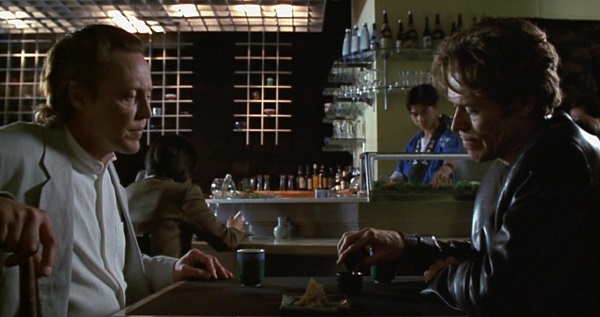 De bout en bout, épaulé par son fidèle complice Chris Zois, Ferrara aura joué les bons chimistes afin d’aboutir à une adaptation capable de garder le même pH qu’un matériau d’origine dont il avait su sonder l’âme véritable. Que le fond opaque et sibyllin de l’intrigue échappe à toute perspective de décodage était déjà un acquis en soi. On en profitera donc pour signaler en quoi l’aptitude de Ferrara et Zois à bousculer l’agencement chronologique des scènes et à retravailler la logique mémorielle de la nouvelle de Gibson suffit à contrer cette accusation de film « incompréhensible » qui n’en finit pas de cibler New Rose Hotel. Parce qu’à bien y regarder, tout s’avère assez simple. Autant jouer cartes sur table en résumant l’intrigue dans son intégralité. En gros, au cœur d’un univers de multinationales où pullulent en secret de sombres machinations (celles, bien sûr, dont l’enjeu finit par échapper à ceux qui tirent les ficelles), Fox (Christopher Walken) et son associé « X » (Willem Dafoe) ont pour mission de détourner Hiroshi (Yoshitaka Amano), brillant généticien japonais au service du consortium industriel Maas, au profit d’un réseau rival nommé Hosaka. En guise d’appât de qualité susceptible de pousser Hiroshi à abandonner sa famille et son travail chez Maas, ils tombent sur Sandii (Asia Argento), call-girl de luxe qui, de par sa beauté et sa sensualité, leur semble parfaitement apte à simuler la passion. X tombe alors fou amoureux de Sandii, laquelle accepte et réussit cette mission d’exfiltration. Sauf que le succès est de courte durée : Fox et X découvrent que l’argent versé sur leur compte a disparu, et que Sandii a libéré un virus qui a décimé tous les experts en génétique du laboratoire d’Hosaka à Marrakech où travaillait désormais Hiroshi. Convaincus d’avoir été trahis par Sandii (a-t-elle été « retournée » selon le vocabulaire espion ? était-elle dés le départ un agent double ?), les deux hommes se savent donc traqués par les sbires de Maas. Pris en étau pendant sa fuite, Fox se suicide. De son côté, X trouve refuge au New Rose Hotel, situé en bordure d’un aéroport. Tout en attendant la mort, il tente de recomposer le fil des événements tout en se remémorant son amour passionnel pour Sandii.