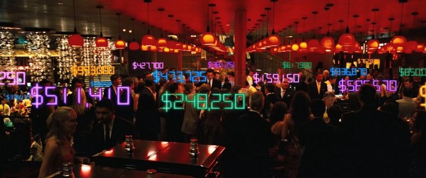 Devant un obstacle aussi retors, on le disait plus haut, c’est l’analogique le plus primaire qui va dérégler la machinerie numérique – on utilise une foreuse dernier cri pour simuler un séisme et mettre ainsi le Greco à l’arrêt. Pour autant, c’est la quinte flush qui fait le plus d’effet : une suite de cartes ordonnées en amont qu’il s’agit de mettre sur le tapis au moment le plus décisif, à l’image d’un scénario pensé et structuré comme un jeu de hasard bidonné de partout. Que l’on ait toujours un coup de retard sur les personnages coule de source, mais que l’on puisse y voir une solution de facilité narrative prouve juste qu’on se la coule douce au lieu de rester actif. Cela tient au fait que la trilogie Ocean’s repose sur les épaules de scénaristes qui jouent une partie dont ils finissent eux-mêmes par se jouer avec malice. Pour Ocean’s 13, le choix de Brian Koppelman et David Levien est peut-être le plus payant de tous, tant Les Joueurs et Le Maître du jeu avaient révélé leur aptitude à fouiller les mécaniques policières et criminelles à partir d’une base documentaire creusée. De ce fait, chaque élément « improbable » de ce scénario impeccablement écrit repose sur du vrai, et cela permet à Soderbergh de plaquer avec brio son brouillage plastique des artifices de la fiction et du documentaire sur un cadre opulent et trompeur. Tout devient ainsi trouble, plus ou moins artificiel, sujet à caution autant que sujet de jouissance. L’argent-roi, soupçonné d’être le moteur du projet aux yeux d’une intelligentsia critique plus envieuse qu’autre chose, repasse ainsi du concret à l’abstrait – notons l’affichage de dollars virtuels au-dessus des crânes de ceux qui font sauter The Bank. Fort de cette mécanique à toute épreuve, le film n’a plus qu’à mettre en pratique tout ce qui ne relève plus de la théorie à ses yeux : des règles à suivre ou à réécrire, des schémas à tracer ou à reproduire, le tout dans un décor dingue et shooté comme un Rubik’s Cube géant.