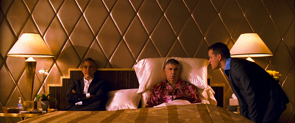 Ce dernier détail est précisément celui qui, au second plan, isole l’une des plus grandes forces de la saga : jouer sur le langage et le sens caché. Ici, on donne dans le clin d’œil référentiel, que ce soit pour désigner quelqu’un (« Celui qui a le chapeau du Dr Dolittle »), pour créer un écho savoureux (le thème culte du Docteur Jivago accompagne la scène de séduction entre Matt Damon et Ellen Barkin) ou pour décrire des règles du jeu. Ici, donner une seconde chance à quelqu’un, c’est faire un « Billy Martin ». Faire flipper quelqu’un en pointant la menace d’un séisme sur son gratte-ciel, ça s’appelle un « Irwin Allen » (en rapport à La Tour infernale, sans aucun doute). Celui à qui l’on fait décrocher le jackpot reçoit un « Ali Baba ». Le nom du filtre aphrodisiaque destiné à envoûter une cible est surnommé un « Gilroy » (on vous laisse en déduire s’il existe un rapport avec la famille de scénaristes/producteurs). On parle d’un « Brody » quand il s’agit d’évoquer le faux pif de Matt Damon ou d’un « Macbeth » pour définir une mise en garde faussée du méchant en cas de pépin. Et pour ce qui est d’un Andy Garcia désireux de briser la montée en puissance d’Al Pacino, on présume que ceux qui ont déjà vu cent fois Le Parrain III auront fait le rapprochement rien qu’en regardant l’affiche.