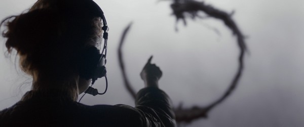 • Le film s’écrit beaucoup à travers des éléments immatériels : l’air et le vide. L’air et l’atmosphère sont souvent rendus visibles par la brume ou les nuages. Or dans les arts asiatiques, du bouddhisme zen au taoïsme, le Vide n’est pas l’équivalent du Néant mais bien d’un espace dynamique où s’accomplissent les transitions, ou se lient tous les contraires. Et c’est bien dans l’atmosphère extra-terrestre composée d’une épaisse brume que Louise comprend que passé et avenir peuvent interagir. Aussi, quand Louise pénètre le vaisseau ovoïde pour la première fois, son regard s’attarde sur l’ascenseur de transport qui s’éloigne car le vide qui les sépare est vertigineux et marque la distance qui la sépare du réel. Le plan suivant montre l’effet de l’apesanteur sur l’équipe scientifique et désoriente le spectateur, lui faisant perdre ses repères spatiaux terrestres et incarnant le Vide intelligible et agissant. Bien plus tard, lorsque Louise téléphone au Général Chang via une ligne sécurisée, on nous immerge dans une pièce cubique blanche. L’espace semble désaffecté et hors du temps, comme fait de géométrie pure. Ce vide permet à Louise d’interagir avec le futur et ainsi de mettre en pratique l’enseignement d’Abott. On pourrait également citer les multiples vitres, voiles ou bokeh qui s’intercalent entre les décors et signent les espaces seuils.