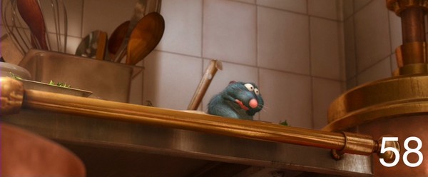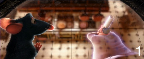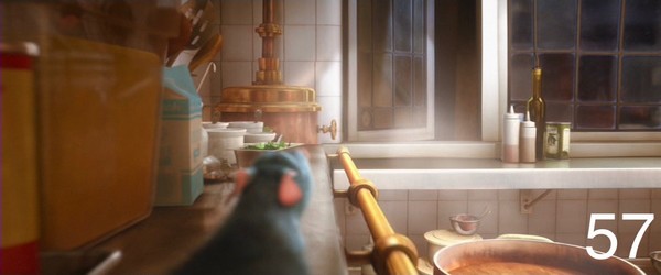 Après une classique présentation de l’intérieur et de ses personnages dont le fraîchement débarqué Linguini, le film se reconcentre sur Rémy. La transition se passe en douceur par un plan en plongée qui recule pour révéler le point de vue de notre héros (image 1). Tout le début de la séquence va se structurer en champ-contrechamp avec cette alternance entre plan en plongée sur la cuisine (image 2) et contre-plongée sur Rémy (image 3). Du haut de son perchoir, celui-ci examine l’organisation de la cuisine et sa conscience le pousse à étaler tout son savoir sur le sujet. Remy se complait dans ses compétences purement théoriques. La contre-plongée le place dans une position de force confortable. Dans ces plans, le cadre est resserré sur sa personne alors que les humains vaquant à leurs occupations sont filmés en hauteur et réduits à de modestes figures. Ces plans en contre-plongée sont des vues subjectives de Remy et son regard glisse sereinement d’un élément à l’autre. On y voit toute sa confiance quant à ses connaissances. Toutefois, il n’est pas omis de préciser l’incompatibilité du monde de Rémy et celui de la cuisine. Tous les plans sont donc filmés à travers la fenêtre qui marque la séparation des deux mondes. Pour appuyer la présence de cette barrière, Bird et son équipe ont mis dessus un grillage qui remplit d’ailleurs une fonction supplémentaire. Au-delà d’emprisonner Rémy à l’extérieur de la cuisine lors des plans en contre-plongée, il ajoute à l’aspect parfaitement agencé de la cuisine dans les plans en plongée. On note en effet que le grillage reste parallèle avec le carrelage, renforçant la perfection géométrique de l’environnement et son extrême méthodisme.